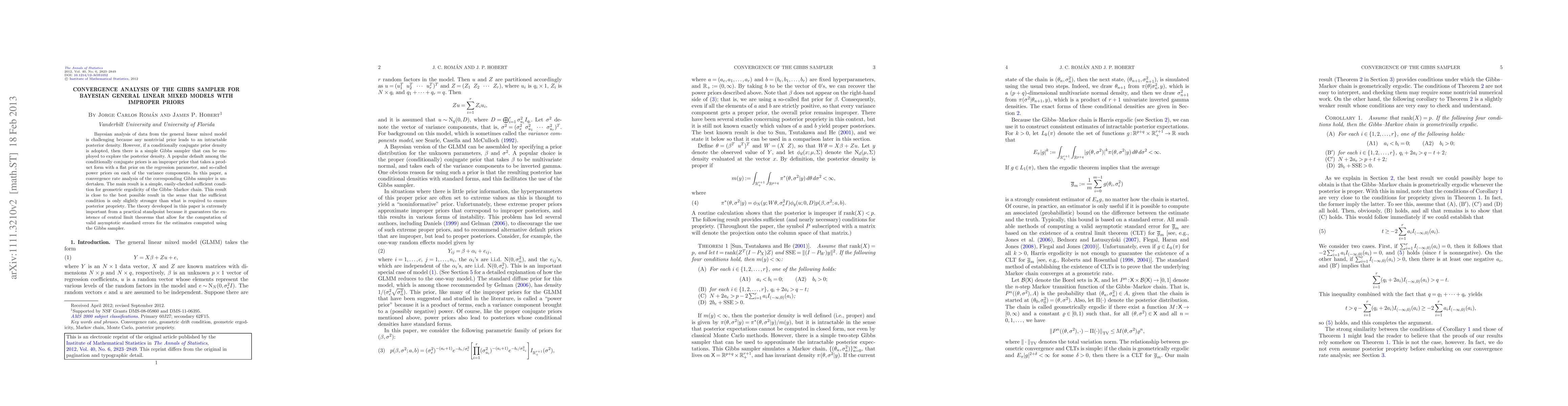 This paper analyzes the convergence rate of the Gibbs sampler for Bayesian general linear mixed models with improper priors, establishing a sufficient condition for geometric ergodicity. The result ensures the existence of central limit theorems, allowing for valid computation of asymptotic standard errors.