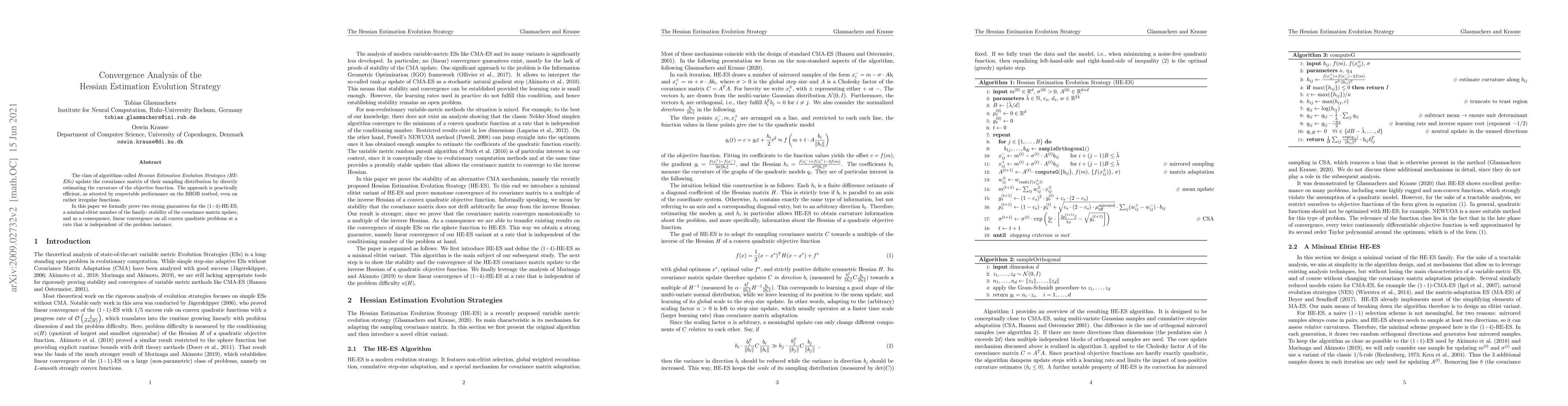 The Hessian Estimation Evolution Strategy (HEES) is a variable metric optimization algorithm that adapts the covariance matrix of the search direction.