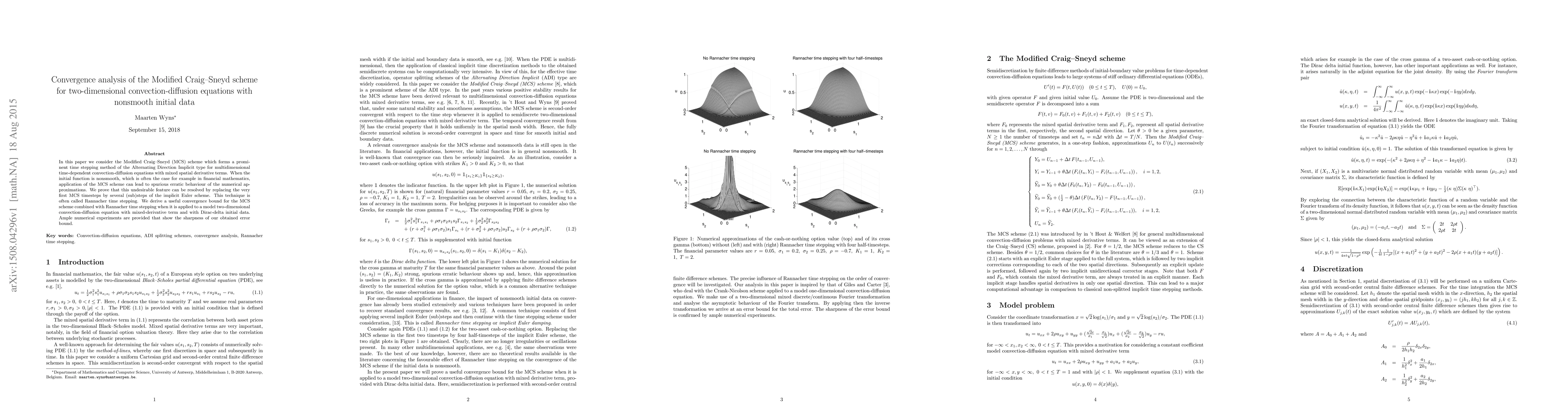 This paper investigates the Modified Craig-Sneyd (MCS) scheme for solving multidimensional convection-diffusion equations, showing that its initial nonsmooth data can lead to erratic behavior. The authors propose using Rannacher time stepping to mitigate this issue and derive a convergence bound for the MCS scheme, supported by numerical experiments validating the effectiveness of their approach.