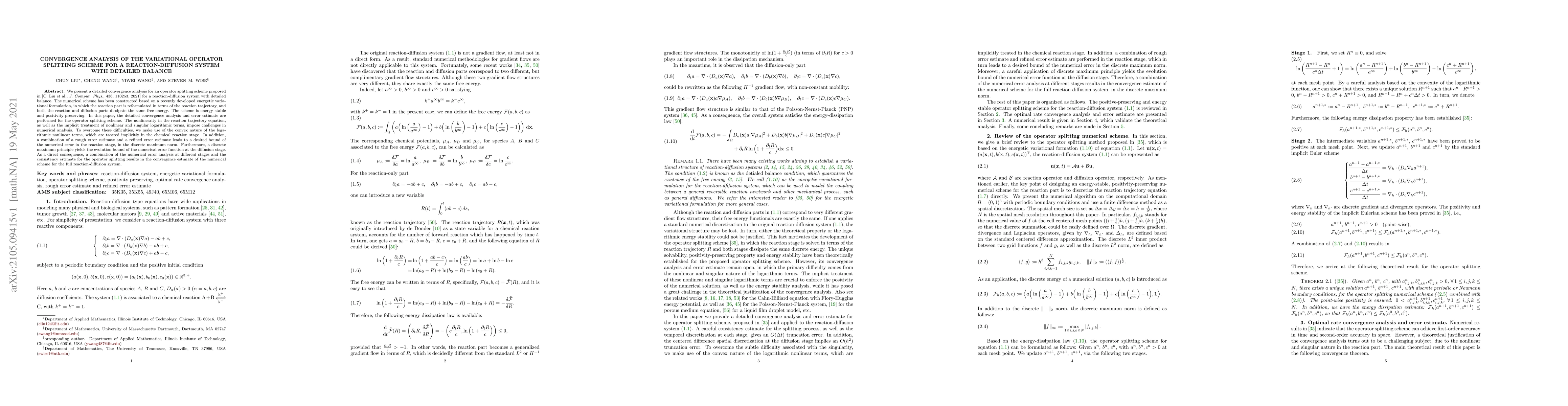 This paper conducts a detailed convergence analysis for an operator splitting scheme for a reaction-diffusion system with detailed balance, showing energy stability and positivity preservation. The analysis addresses the challenges posed by the nonlinearity and implicit treatment of logarithmic terms, leading to a convergence estimate for the full system.