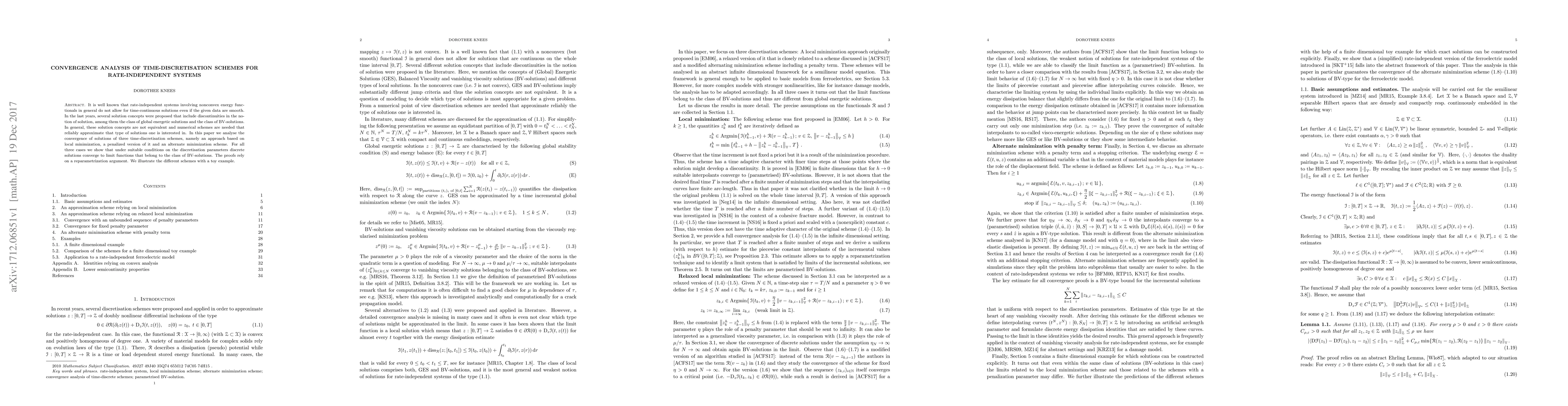This paper analyzes the convergence of three time-discretisation schemes for rate-independent systems, showing that under suitable conditions, discrete solutions converge to limit functions that belong to the class of BV-solutions.