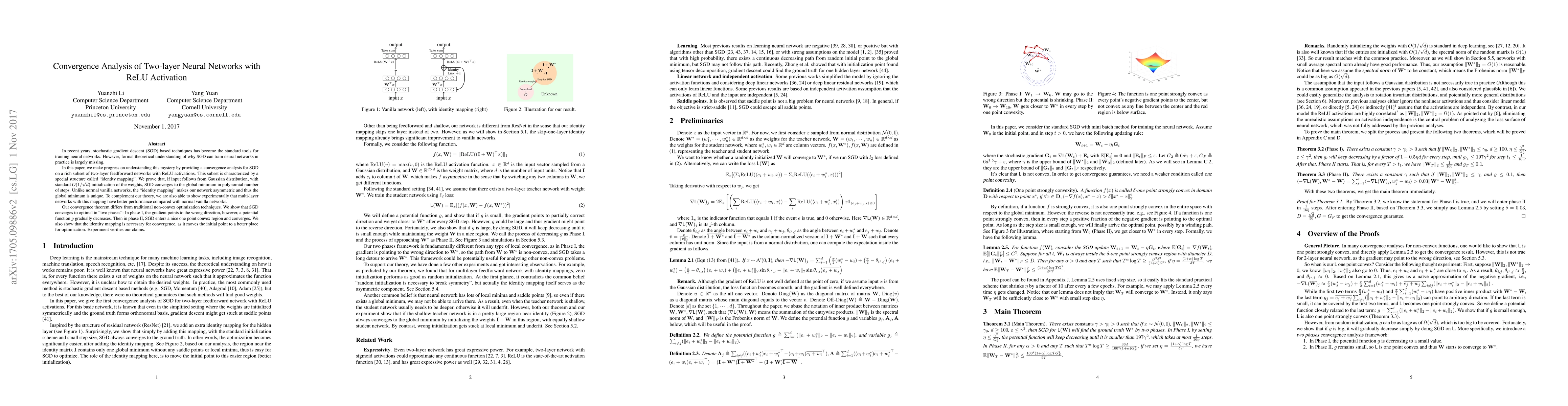 In recent years, stochastic gradient descent (SGD) based techniques has become the standard tools for training neural networks. However, formal theoretical understanding of why SGD can train neural networks in practice is largely missing. In this paper, we make progress on understanding this mystery by providing a convergence analysis for SGD on a rich subset of two-layer feedforward networks with ReLU activations. This subset is characterized by a special structure called "identity mapping". We prove that, if input follows from Gaussian distribution, with standard $O(1/\sqrt{d})$ initialization of the weights, SGD converges to the global minimum in polynomial number of steps. Unlike normal vanilla networks, the "identity mapping" makes our network asymmetric and thus the global minimum is unique. To complement our theory, we are also able to show experimentally that multi-layer networks with this mapping have better performance compared with normal vanilla networks. Our convergence theorem differs from traditional non-convex optimization techniques. We show that SGD converges to optimal in "two phases": In phase I, the gradient points to the wrong direction, however, a potential function $g$ gradually decreases. Then in phase II, SGD enters a nice one point convex region and converges. We also show that the identity mapping is necessary for convergence, as it moves the initial point to a better place for optimization. Experiment verifies our claims.