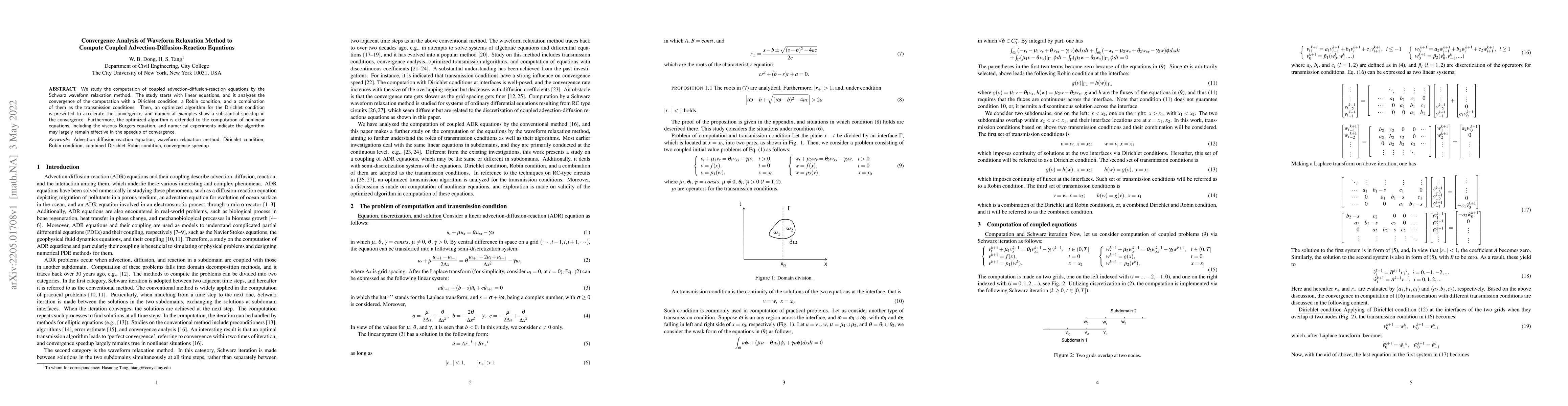 We study the computation of coupled advection-diffusion-reaction equations by the Schwarz waveform relaxation method. The study starts with linear equations, and it analyzes the convergence of the computation with a Dirichlet condition, a Robin condition, and a combination of them as the transmission conditions. Then, an optimized algorithm for the Dirichlet condition is presented to accelerate the convergence, and numerical examples show a substantial speedup in the convergence. Furthermore, the optimized algorithm is extended to the computation of nonlinear equations, including the viscous Burgers equation, and numerical experiments indicate the algorithm may largely remain effective in the speedup of convergence.