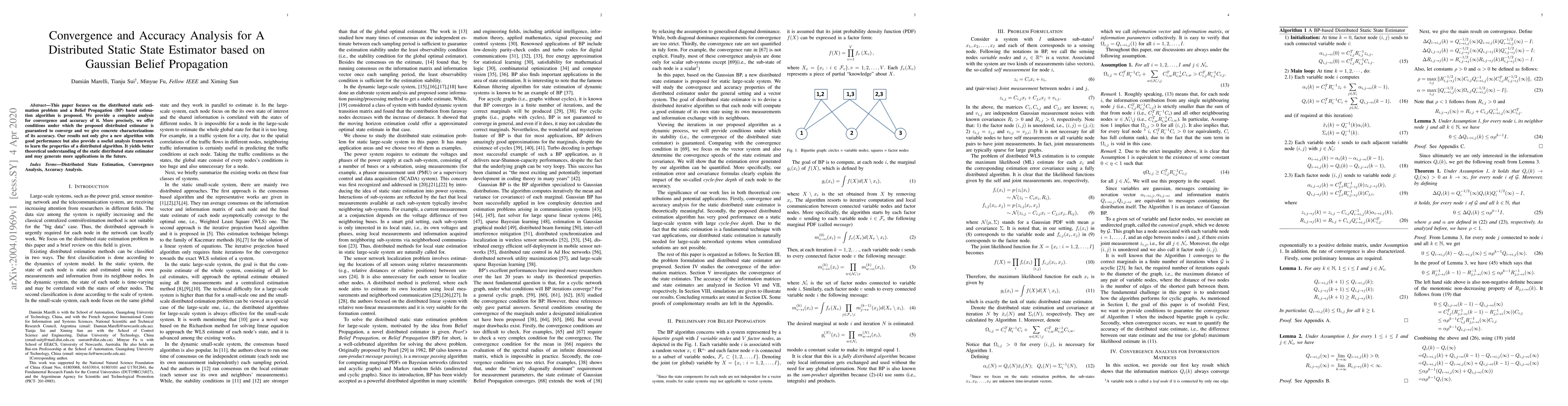 This paper proposes a Gaussian Belief Propagation-based distributed static state estimator, analyzes its convergence conditions, and characterizes its accuracy, offering a new algorithm with strong performance and a useful framework for understanding distributed algorithms.