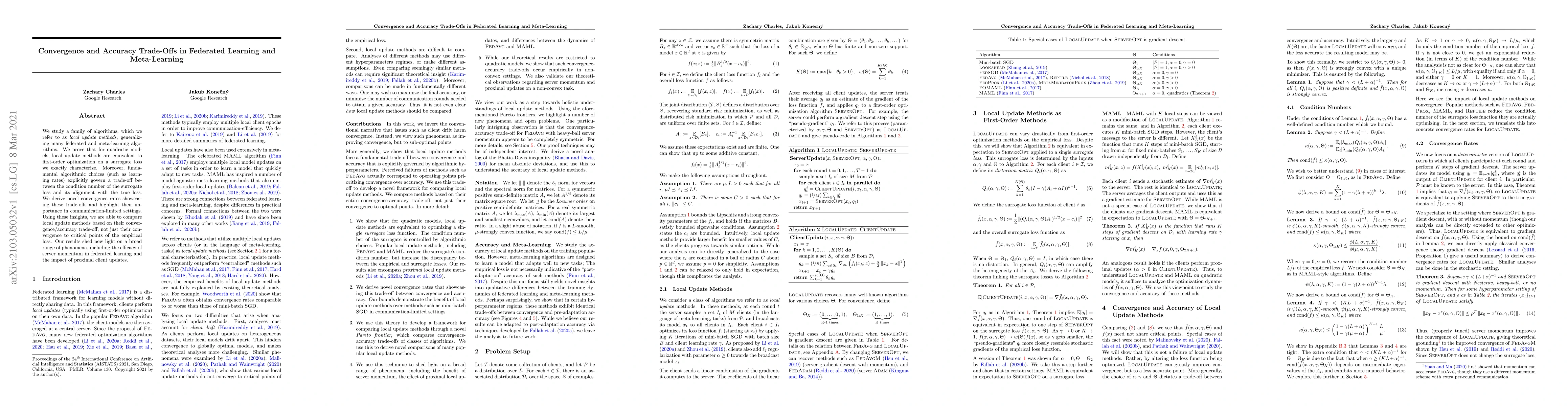 This paper investigates the convergence and accuracy trade-offs in local update methods for federated and meta-learning algorithms, showing they are equivalent to first-order optimization on a characterized surrogate loss. It highlights how algorithmic choices affect the balance between the surrogate loss's condition number and alignment with the true loss, leading to novel convergence rates that are crucial in communication-limited environments.