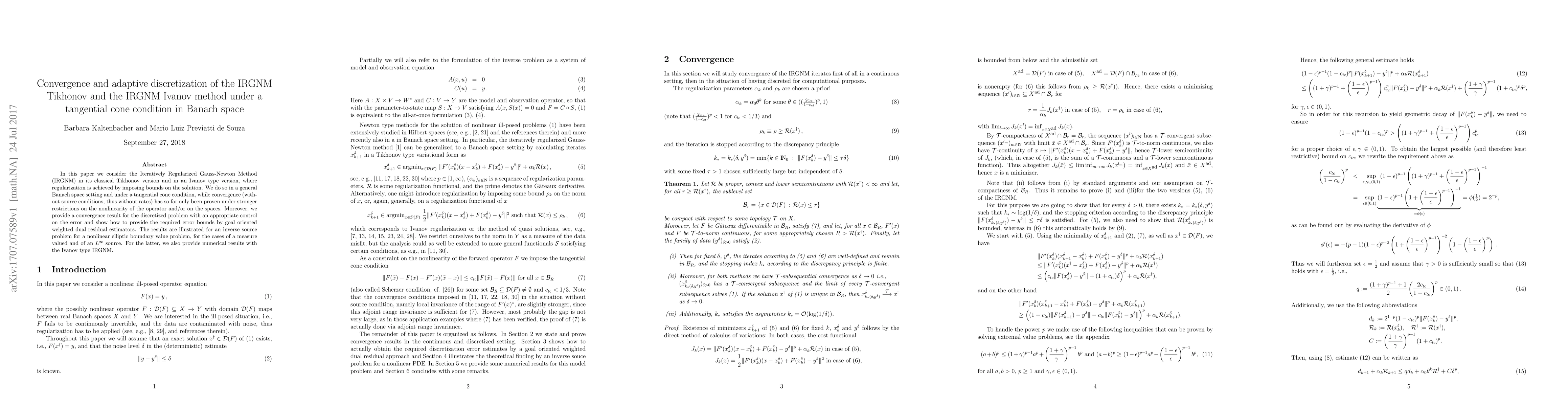 In this paper we consider the Iteratively Regularized Gauss-Newton Method (IRGNM) in its classical Tikhonov version and in an Ivanov type version, where regularization is achieved by imposing bounds on the solution. We do so in a general Banach space setting and under a tangential cone condition, while convergence (without source conditions, thus without rates) has so far only been proven under stronger restrictions on the nonlinearity of the operator and/or on the spaces. Moreover, we provide a convergence result for the discretized problem with an appropriate control on the error and show how to provide the required error bounds by goal oriented weighted dual residual estimators. The results are illustrated for an inverse source problem for a nonlinear elliptic boundary value problem, for the cases of a measure valued and of an $L^\infty$ source. For the latter, we also provide numerical results with the Ivanov type IRGNM.