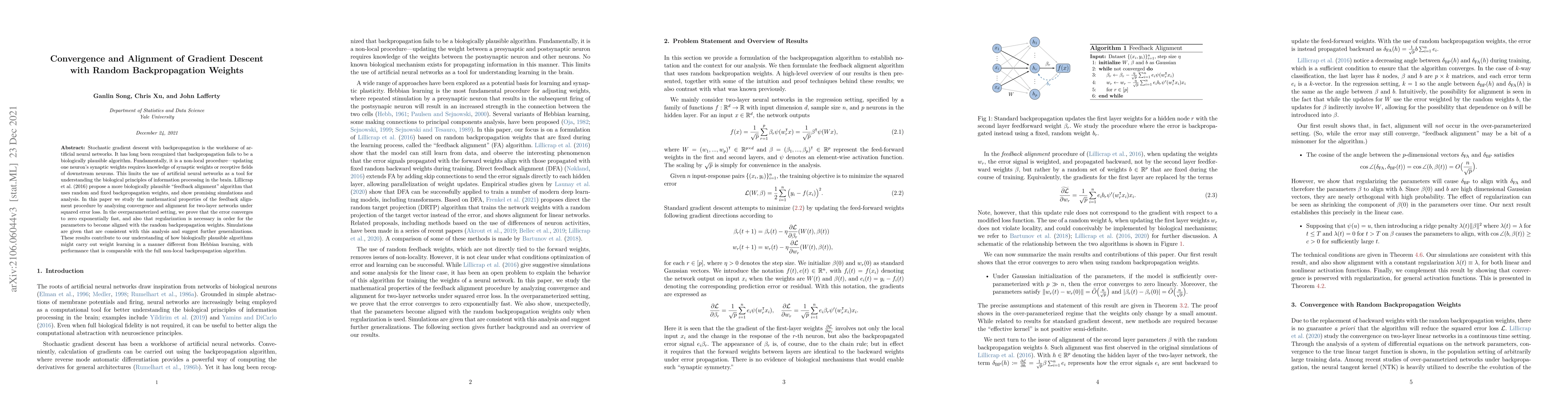 This paper investigates the convergence and alignment properties of the biologically plausible "feedback alignment" algorithm, demonstrating exponential convergence to zero error in overparameterized networks and the necessity of regularization for weight alignment. Simulations support these findings and suggest potential generalizations.
