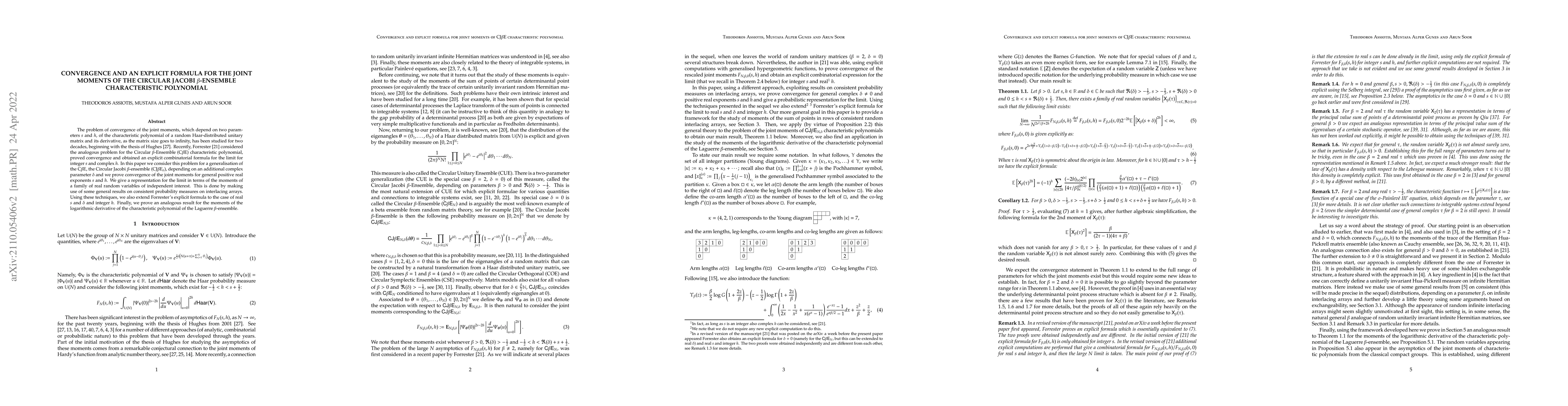 The problem of convergence of the joint moments, which depend on two parameters $s$ and $h$, of the characteristic polynomial of a random Haar-distributed unitary matrix and its derivative, as the matrix size goes to infinity, has been studied for two decades, beginning with the thesis of Hughes. Recently, Forrester considered the analogous problem for the Circular $\beta$-Ensemble (C$\beta$E) characteristic polynomial, proved convergence and obtained an explicit combinatorial formula for the limit for integer $s$ and complex $h$. In this paper we consider this problem for a generalisation of the C$\beta$E, the Circular Jacobi $\beta$-ensemble (CJ$\beta$E), depending on an additional complex parameter $\delta$ and we prove convergence of the joint moments for general positive real exponents $s$ and $h$. We give a representation for the limit in terms of the moments of a family of real random variables of independent interest. This is done by making use of some general results on consistent probability measures on interlacing arrays. Using these techniques, we also extend Forrester's explicit formula to the case of real $s$ and $\delta$ and integer $h$. Finally, we prove an analogous result for the moments of the logarithmic derivative of the characteristic polynomial of the Laguerre $\beta$-ensemble.