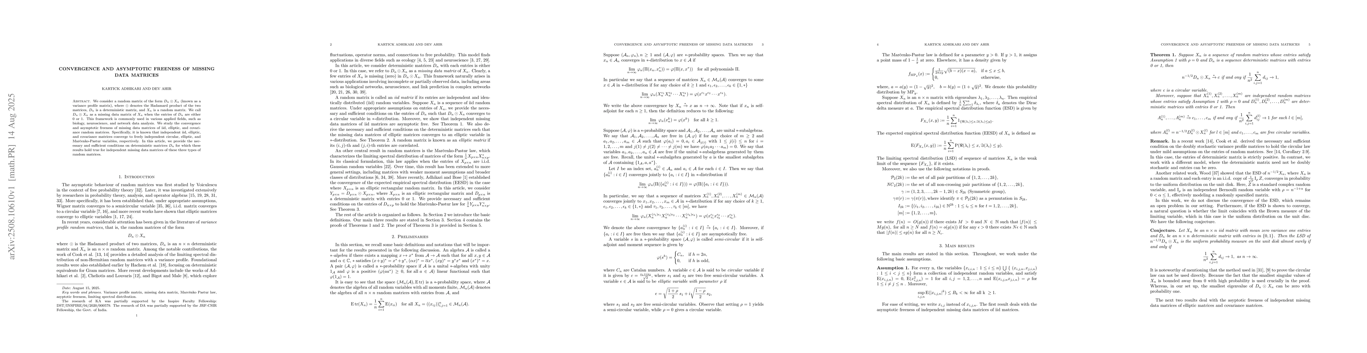 We consider a random matrix of the form $D_n \odot X_n$ (known as a variance profile matrix), where $\odot$ denotes the Hadamard product of the two matrices, $D_n$ is a deterministic matrix, and $X_n$ is a random matrix. We call $D_n\odot X_n$ as a missing data matrix of $X_n$ when the entries of $D_n$ are either $0$ or $1$. This framework is commonly used in various applied fields, such as biology, neuroscience, and network data analysis. We study the convergence and asymptotic freeness of missing data matrices of iid, elliptic, and covariance random matrices. Specifically, it is known that independent iid, elliptic, and covariance matrices converge to freely independent circular, elliptic, and Mar\v{c}enko-Pastur variables, respectively. In this article, we provide the necessary and sufficient conditions on deterministic matrices $D_n$ for which these results hold true for independent missing data matrices of these three types of random matrices.
