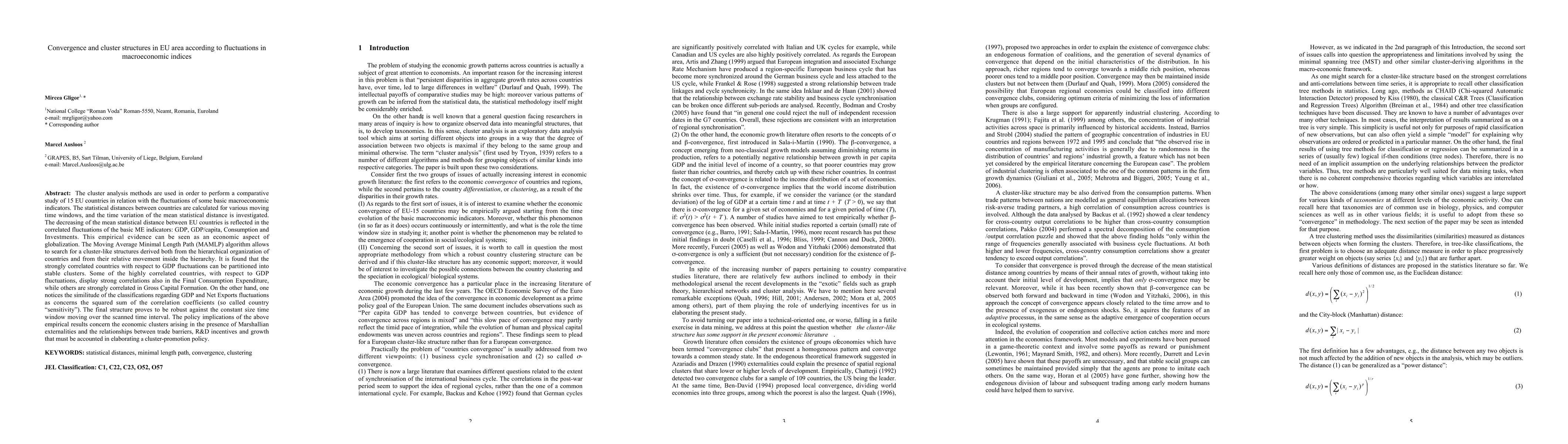 The cluster analysis methods are used in order to perform a comparative study of 15 EU countries in relation with the fluctuations of some basic macroeconomic indicators. The statistical distances between countries are calculated for various moving time windows, and the time variation of the mean statistical distance is investigated. The decreasing of the mean statistical distance between EU countries is reflected in the correlated fluctuations of the basic ME indicators: GDP, GDP/capita, Consumption and Investments. This empirical evidence can be seen as an economic aspect of globalization. The Moving Average Minimal Length Path (MAMLP) algorithm allows to search for a cluster-like structures derived both from the hierarchical organization of countries and from their relative movement inside the hierarchy. It is found that the strongly correlated countries with respect to GDP fluctuations can be partitioned into stable clusters. Some of the highly correlated countries, with respect to GDP fluctuations, display strong correlations also in the Final Consumption Expenditure, while others are strongly correlated in Gross Capital Formation. On the other hand, one notices the similitude of the classifications regarding GDP and Net Exports fluctuations as concerns the squared sum of the correlation coefficients (so called country sensitivity). The final structure proves to be robust against the constant size time window moving over the scanned time interval. The policy implications of the above empirical results concern the economic clusters arising in the presence of Marshallian externalities and the relationships between trade barriers, R&D incentives and growth that must be accounted in elaborating a cluster-promotion policy.