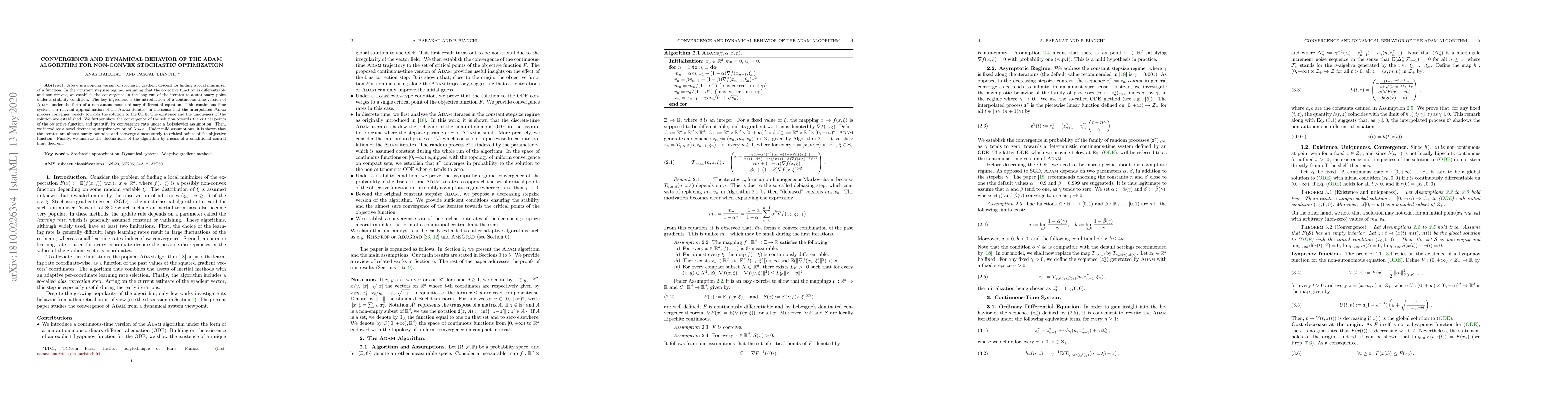 This paper investigates the convergence and dynamical behavior of the ADAM algorithm for non-convex stochastic optimization, establishing its convergence to stationary points under a stability condition. It introduces a continuous-time approximation of ADAM and proves its convergence rate and fluctuations via a conditional central limit theorem.
