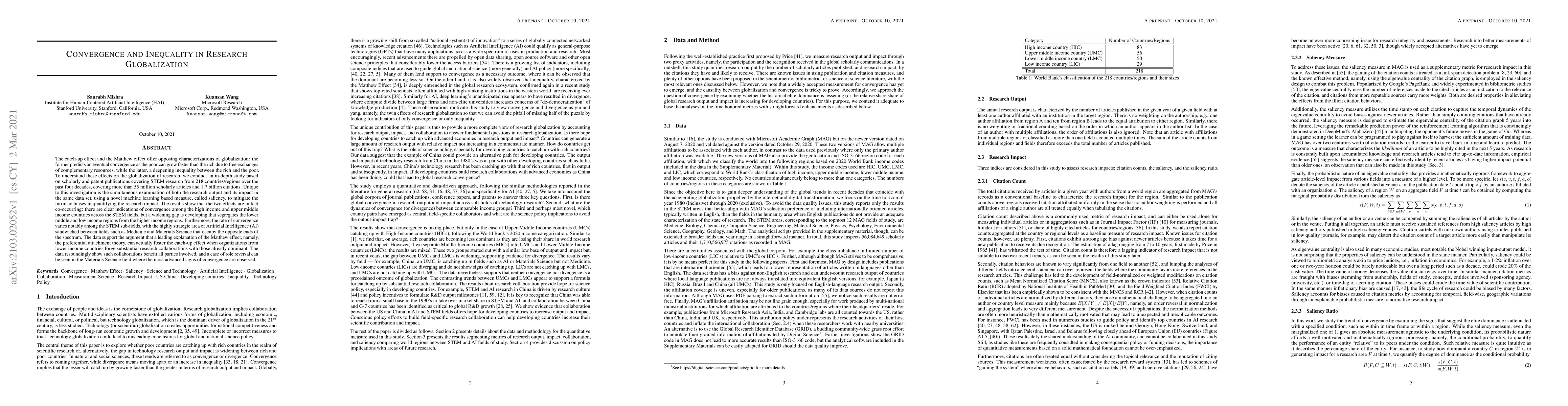 The catch-up effect and the Matthew effect offer opposing characterizations of globalization: the former predicts an eventual convergence as the poor can grow faster than the rich due to free exchanges of complementary resources, while the latter, a deepening inequality between the rich and the poor. To understand these effects on the globalization of research, we conduct an in-depth study based on scholarly and patent publications covering STEM research from 218 countries/regions over the past four decades, covering more than 55 million scholarly articles and 1.7 billion citations. Unique to this investigation is the simultaneous examination of both the research output and its impact in the same data set, using a novel machine learning based measure, called saliency, to mitigate the intrinsic biases in quantifying the research impact. The results show that the two effects are in fact co-occurring: there are clear indications of convergence among the high income and upper middle income countries across the STEM fields, but a widening gap is developing that segregates the lower middle and low income regions from the higher income regions. Furthermore, the rate of convergence varies notably among the STEM sub-fields, with the highly strategic area of Artificial Intelligence (AI) sandwiched between fields such as Medicine and Materials Science that occupy the opposite ends of the spectrum. The data support the argument that a leading explanation of the Matthew effect, namely, the preferential attachment theory, can actually foster the catch-up effect when organizations from lower income countries forge substantial research collaborations with those already dominant. The data resoundingly show such collaborations benefit all parties involved, and a case of role reversal can be seen in the Materials Science field where the most advanced signs of convergence are observed.