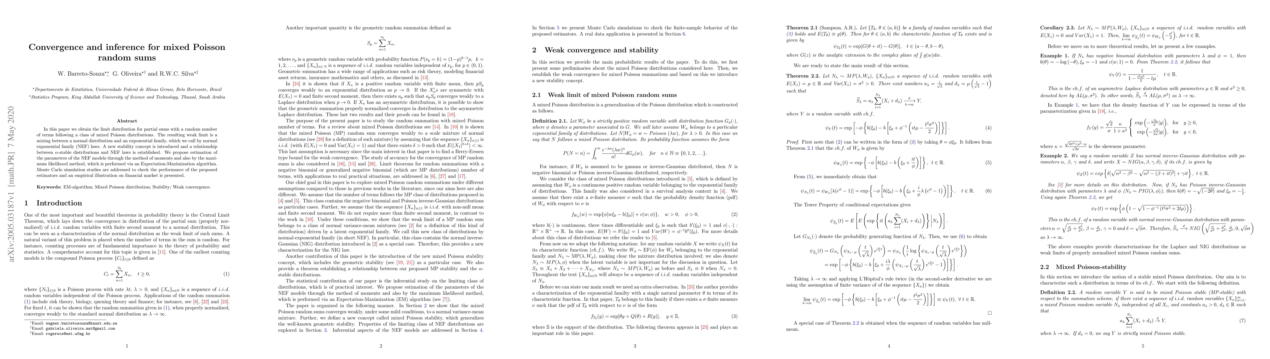 In this paper we obtain the limit distribution for partial sums with a random number of terms following a class of mixed Poisson distributions. The resulting weak limit is a mixing between a normal distribution and an exponential family, which we call by normal exponential family (NEF) laws. A new stability concept is introduced and a relationship between {\alpha}-stable distributions and NEF laws is established. We propose estimation of the parameters of the NEF models through the method of moments and also by the maximum likelihood method, which is performed via an Expectation-Maximization algorithm. Monte Carlo simulation studies are addressed to check the performance of the proposed estimators and an empirical illustration on financial market is presented.