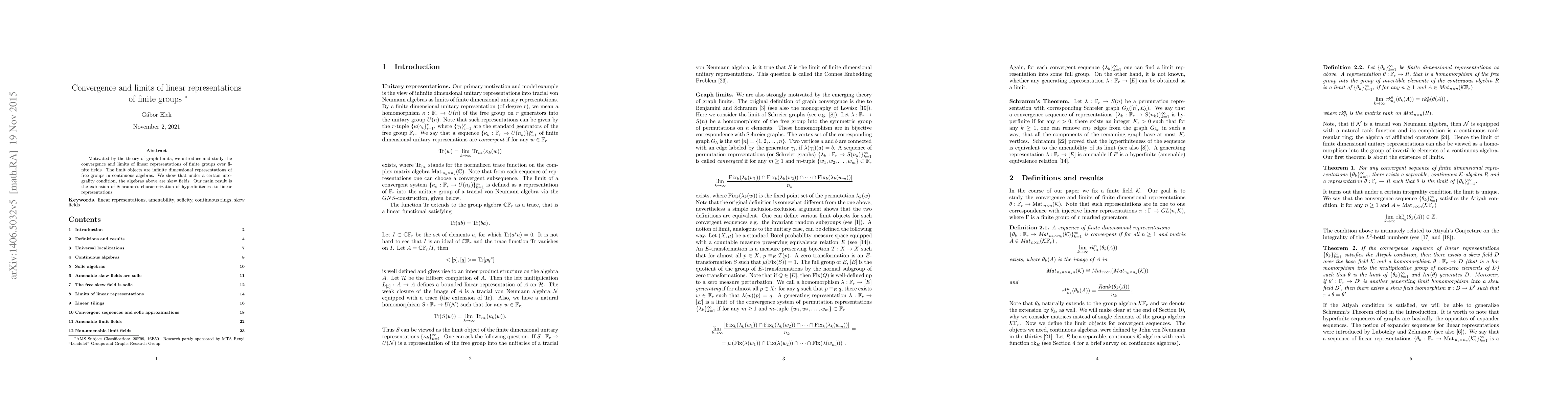 This paper explores the convergence and limits of linear representations of finite groups over finite fields, introducing infinite-dimensional representations of free groups in continuous algebras. It proves that under a specific integrality condition, these algebras become skew fields, extending Schramm's characterization of hyperfiniteness to linear representations.