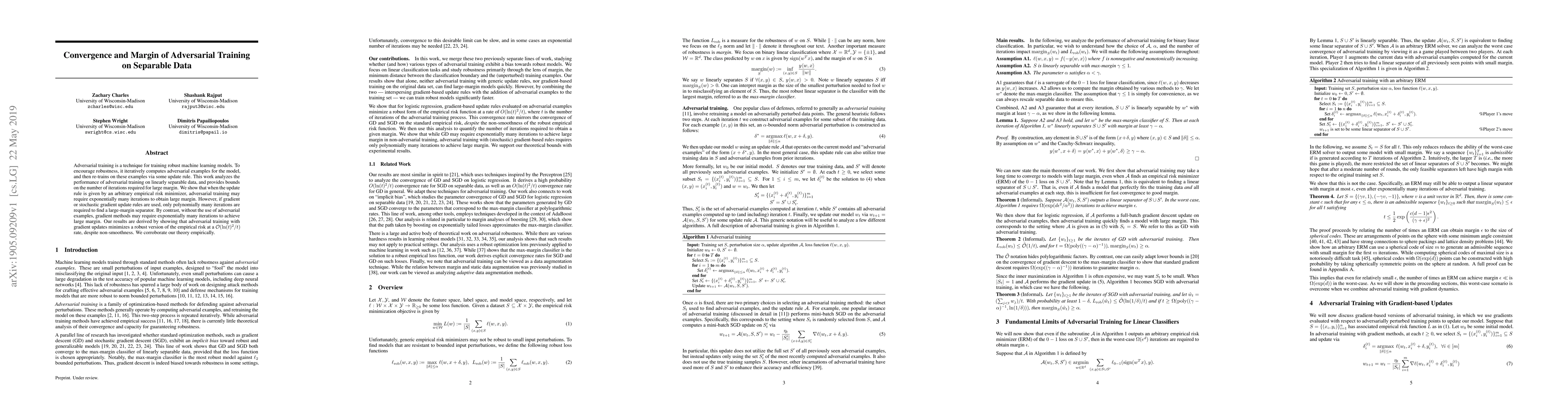 This paper investigates adversarial training on linearly separable data, demonstrating that gradient-based update rules require polynomially many iterations to achieve large margins, while empirical risk minimizers may need exponentially many. Theoretical and empirical results support the efficiency of gradient updates in robust training.