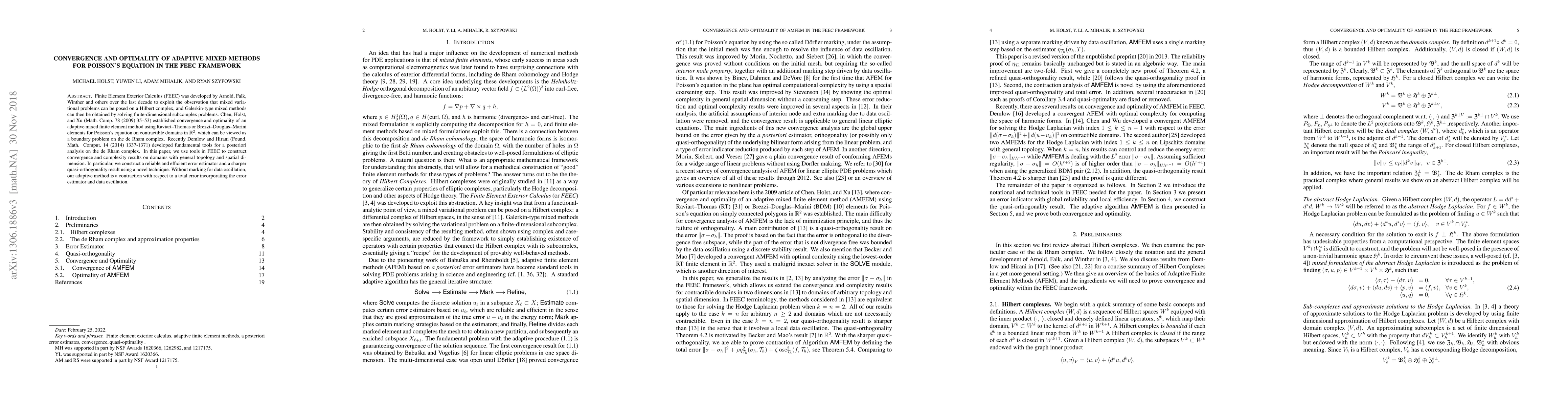 This paper extends the convergence and optimality of adaptive mixed finite element methods for Poisson's equation within the Finite Element Exterior Calculus (FEEC) framework, providing reliable error estimators and sharper quasi-orthogonality results for domains with general topology and dimensions. The adaptive method is shown to be a contraction concerning total error, including data oscillation.
