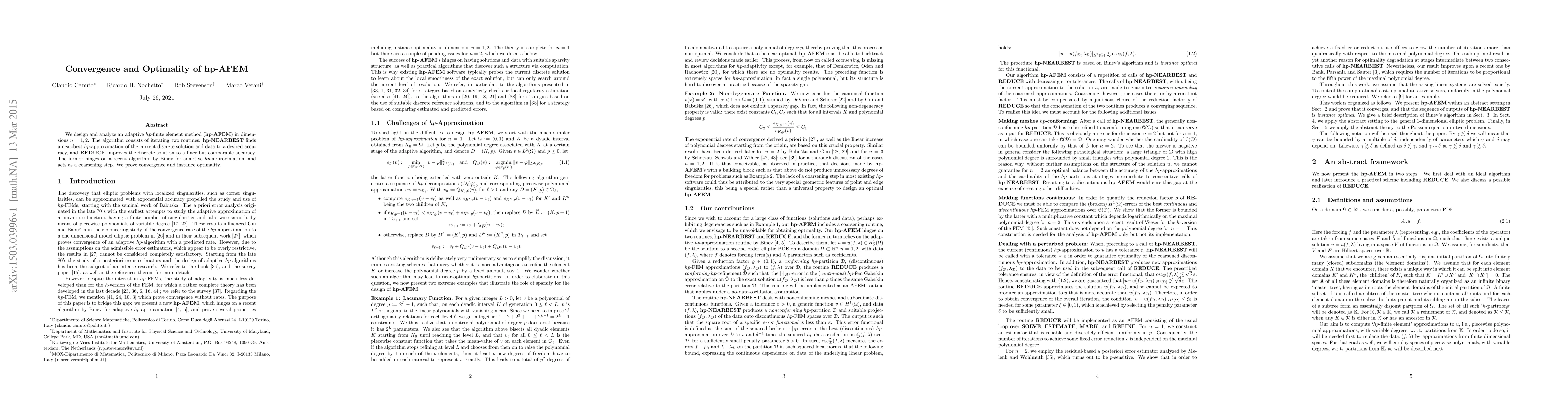 The paper presents an adaptive $hp$-finite element method (hp-AFEM) for solving partial differential equations in 1D and 2D, proving its convergence and optimality through iterative routines that refine the solution using near-best $hp$-approximations.