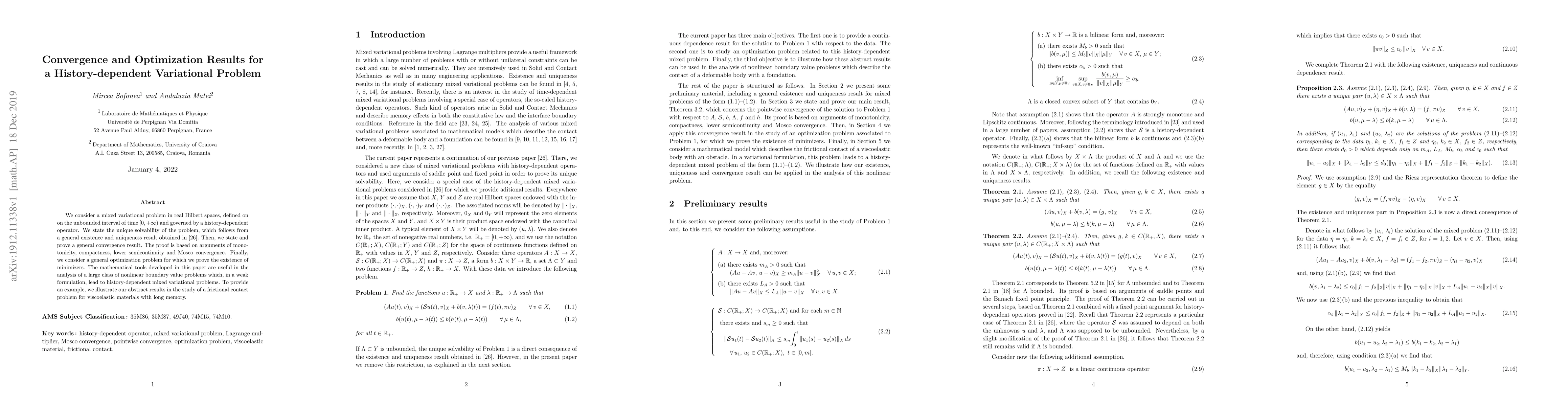We consider a mixed variational problem in real Hilbert spaces, defined on on the unbounded interval of time and governed by a history-dependent operator. We state the unique solvability of the problem, which follows from a general existence and uniqueness result obtained in our previous paper. Then, we state and prove a general convergence result. The proof is based on arguments of monotonicity, compactness, lower semicontinuity and Mosco convergence. Finally, we consider a general optimization problem for which we prove the existence of minimizers. The mathematical tools developed in this paper are useful in the analysis of a large class of nonlinear boundary value problems which, in a weak formulation, lead to history-dependent mixed variational problems. To provide an example, we illustrate our abstract results in the study of a frictional contact problem for viscoelastic materials with long memory.