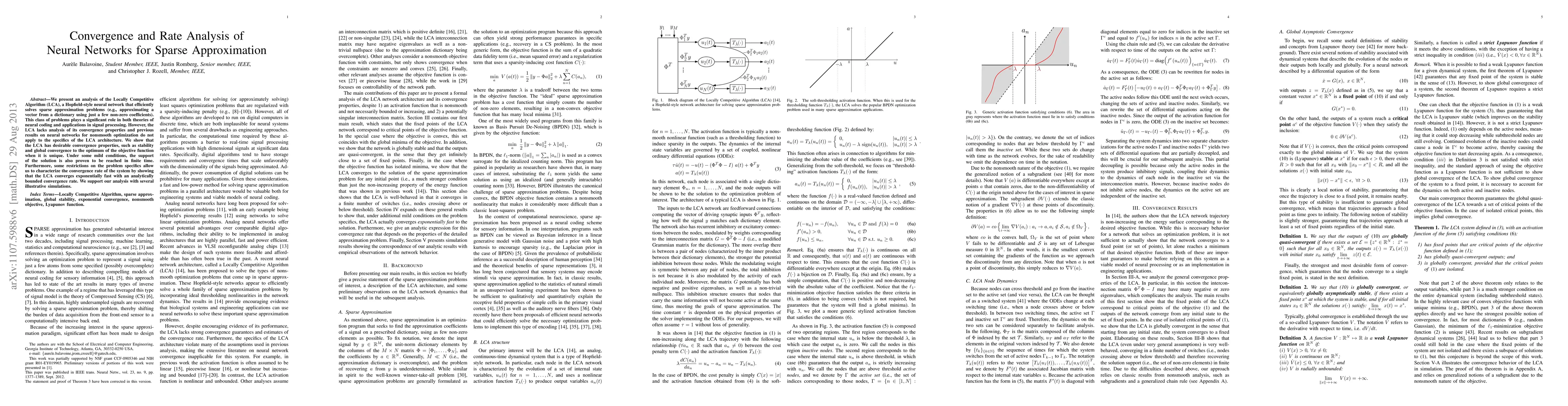 This paper analyzes the Locally Competitive Algorithm (LCA), a Hopfield-style neural network for sparse approximation problems, demonstrating its stability, global convergence, and exponential convergence rate under certain conditions. Simulations support the theoretical findings.