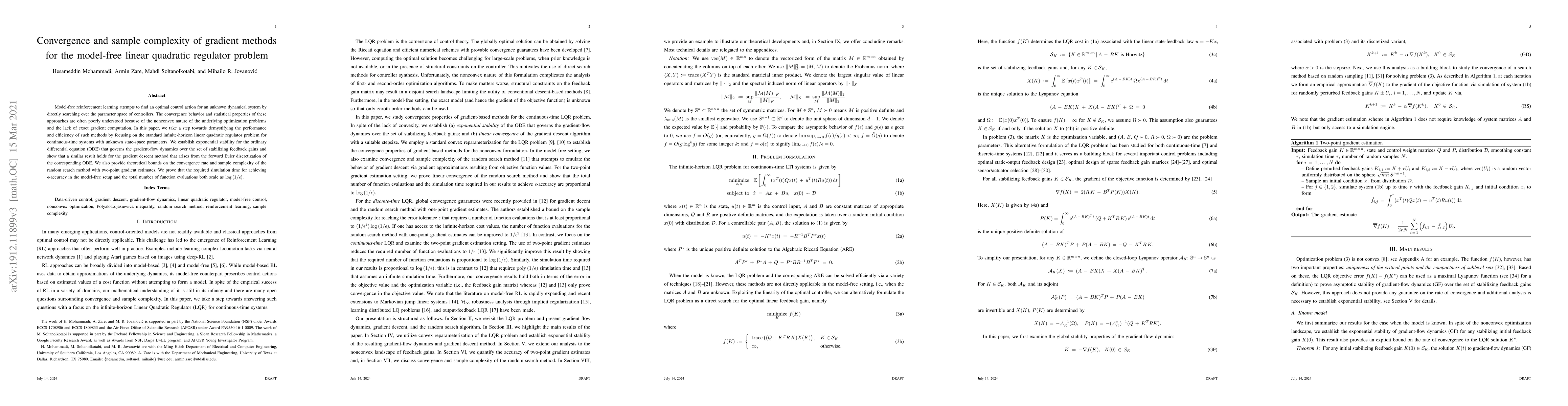 This paper investigates the convergence and sample complexity of gradient methods for the model-free linear quadratic regulator problem, establishing exponential stability for gradient-flow dynamics and providing theoretical bounds on the convergence rate and sample complexity of random search methods. The results show that achieving $\epsilon$-accuracy requires simulation time and function evaluations scaling as $\log \, (1/\epsilon)$.
