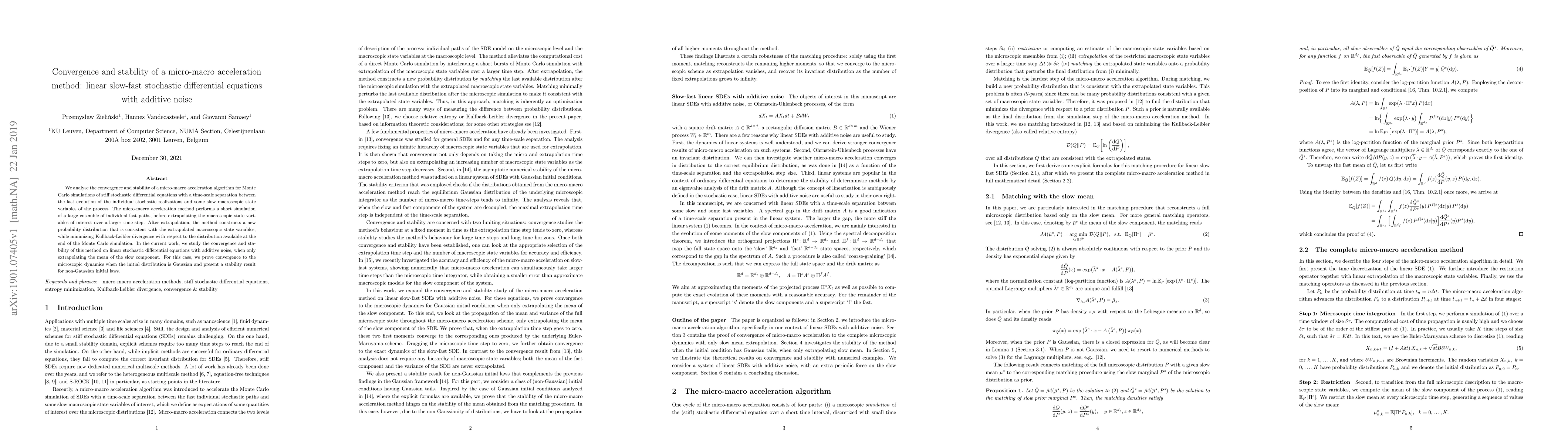 This paper analyzes the convergence and stability of a micro-macro acceleration method for Monte Carlo simulations of linear stochastic differential equations with additive noise. The method extrapolates macroscopic state variables and constructs a new probability distribution, proving convergence for Gaussian initial distributions and stability for non-Gaussian initial laws.