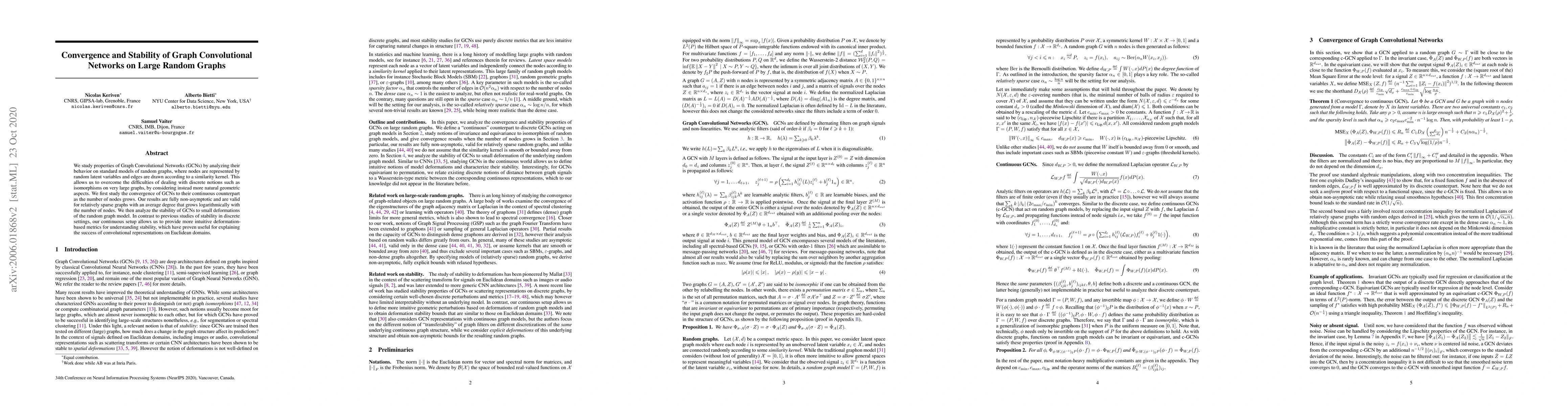 This paper investigates the convergence and stability of Graph Convolutional Networks (GCNs) on large random graphs, demonstrating their behavior through continuous geometric aspects rather than discrete isomorphisms. The study provides non-asymptotic results on GCN convergence and introduces intuitive deformation-based metrics for stability analysis.