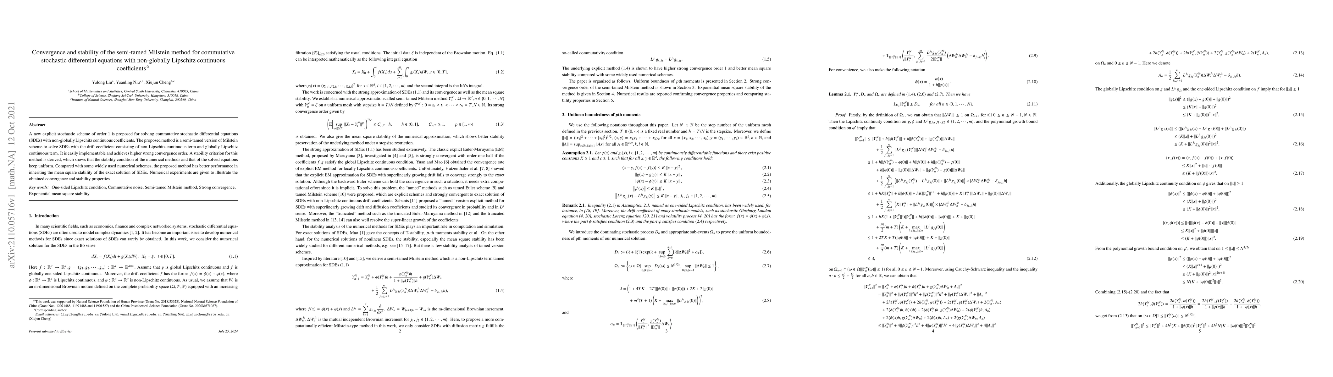 A new explicit stochastic scheme of order 1 is proposed for solving commutative stochastic differential equations (SDEs) with non-globally Lipschitz continuous coefficients. The proposed method is a semi-tamed version of Milstein scheme to solve SDEs with the drift coefficient consisting of non-Lipschitz continuous term and globally Lipschitz continuous term. It is easily implementable and achieves higher strong convergence order. A stability criterion for this method is derived, which shows that the stability condition of the numerical methods and that of the solved equations keep uniform. Compared with some widely used numerical schemes, the proposed method has better performance in inheriting the mean square stability of the exact solution of SDEs. Numerical experiments are given to illustrate the obtained convergence and stability properties.