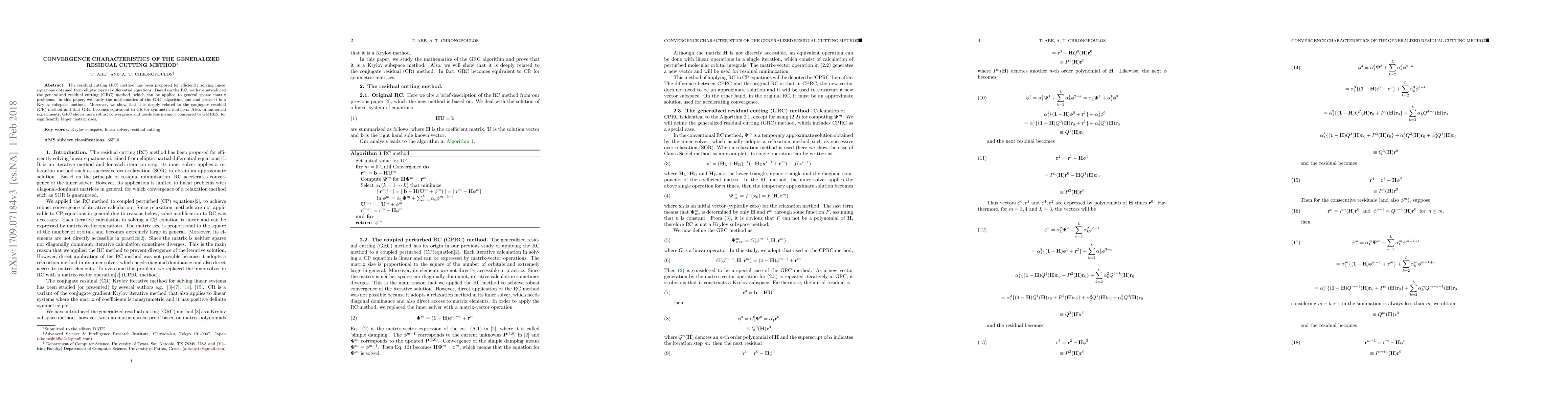 The residual cutting (RC) method has been proposed for efficiently solving linear equations obtained from elliptic partial differential equations. Based on the RC, we have introduced the generalized residual cutting (GRC) method, which can be applied to general sparse matrix problems. In this paper, we study the mathematics of the GRC algorithm and and prove it is a Krylov subspace method. Moreover, we show that it is deeply related to the conjugate residual (CR) method and that GRC becomes equivalent to CR for symmetric matrices. Also, in numerical experiments, GRC shows more robust convergence and needs less memory compared to GMRES, for significantly larger matrix sizes.