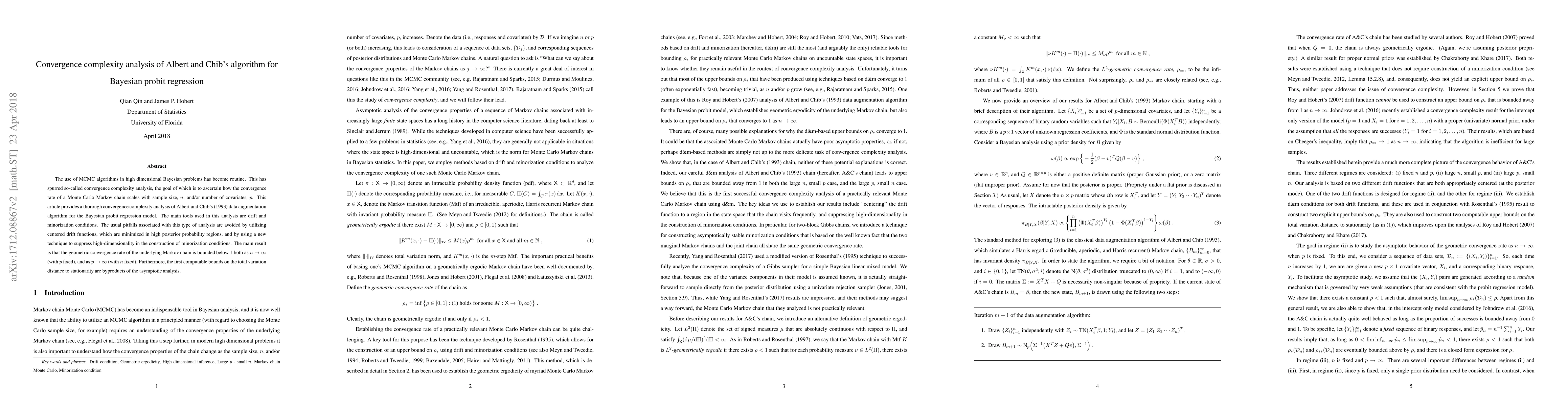 This paper conducts a convergence complexity analysis of Albert and Chib's algorithm for Bayesian probit regression, revealing that the geometric convergence rate of the Markov chain is bounded below 1 under varying sample sizes and covariate numbers. The analysis employs centered drift functions and a novel technique to manage high-dimensionality, providing the first computable bounds on the total variation distance to stationarity.