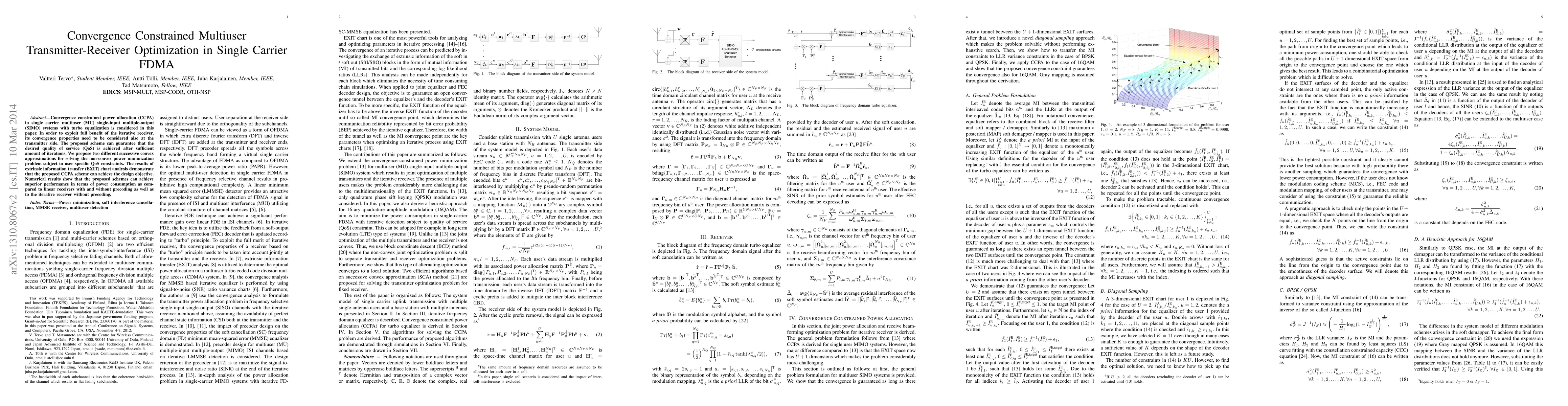 Convergence constrained power allocation (CCPA) in single carrier multiuser (MU) single-input multiple-output (SIMO) systems with turbo equalization is considered in this paper. In order to exploit full benefit of the iterative receiver, its convergence properties need to be considered also at the transmitter side. The proposed scheme can guarantee that the desired quality of service (QoS) is achieved after sufficient amount of iterations. We propose two different successive convex approximations for solving the non-convex power minimization problem subject to user specific QoS constraints. The results of extrinsic information transfer (EXIT) chart analysis demonstrate that the proposed CCPA scheme can achieve the design objective. Numerical results show that the proposed schemes can achieve superior performance in terms of power consumption as compared to linear receivers with and without precoding as well as to the iterative receiver without precoding.