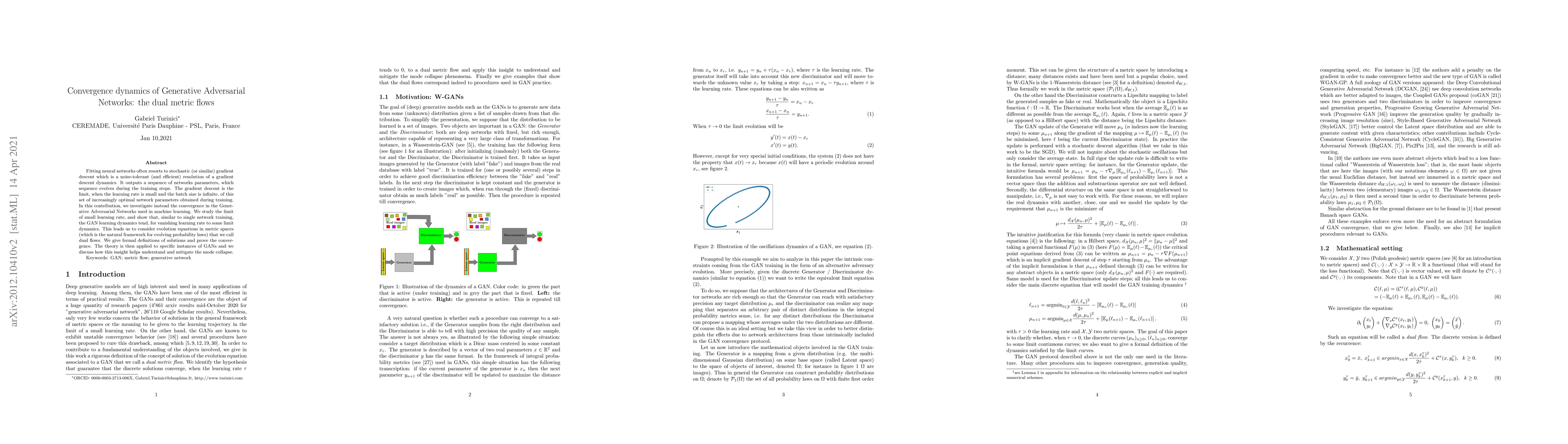 Fitting neural networks often resorts to stochastic (or similar) gradient descent which is a noise-tolerant (and efficient) resolution of a gradient descent dynamics. It outputs a sequence of networks parameters, which sequence evolves during the training steps. The gradient descent is the limit, when the learning rate is small and the batch size is infinite, of this set of increasingly optimal network parameters obtained during training. In this contribution, we investigate instead the convergence in the Generative Adversarial Networks used in machine learning. We study the limit of small learning rate, and show that, similar to single network training, the GAN learning dynamics tend, for vanishing learning rate to some limit dynamics. This leads us to consider evolution equations in metric spaces (which is the natural framework for evolving probability laws) that we call dual flows. We give formal definitions of solutions and prove the convergence. The theory is then applied to specific instances of GANs and we discuss how this insight helps understand and mitigate the mode collapse. Keywords: GAN; metric flow; generative network