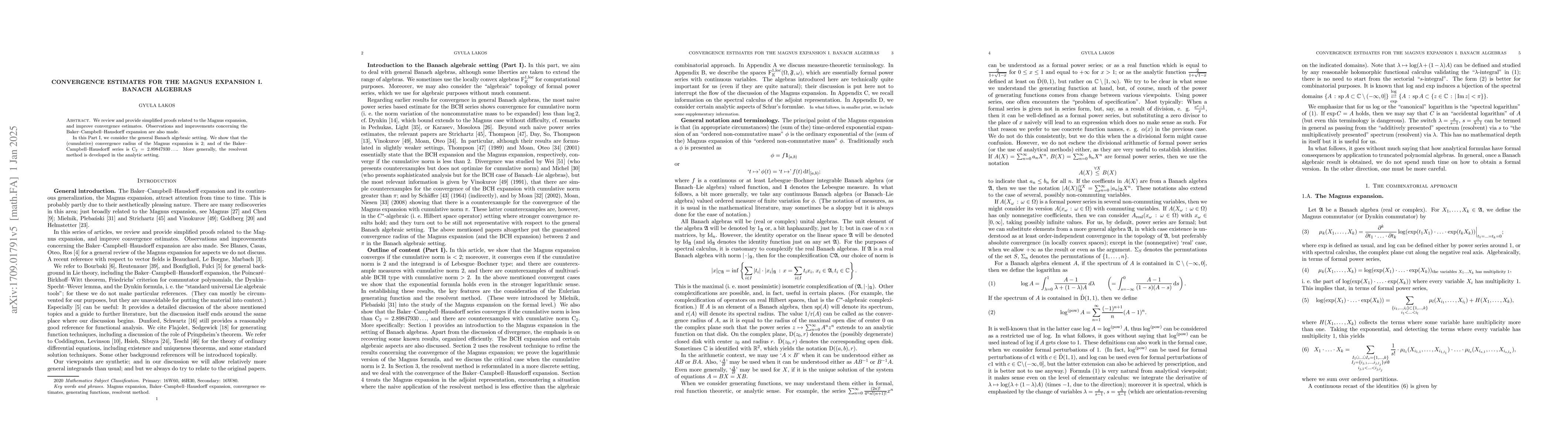 We review and provide simplified proofs related to the Magnus expansion, and improve convergence estimates. Observations and improvements concerning the Baker--Campbell--Hausdorff expansion are also made. In this Part I, we consider the general Banach algebraic setting. We show that the (cumulative) convergence radius of the Magnus expansion is $2$; and of the Baker--Campbell--Hausdorff series is $\mathrm C_2=2.89847930\ldots$.