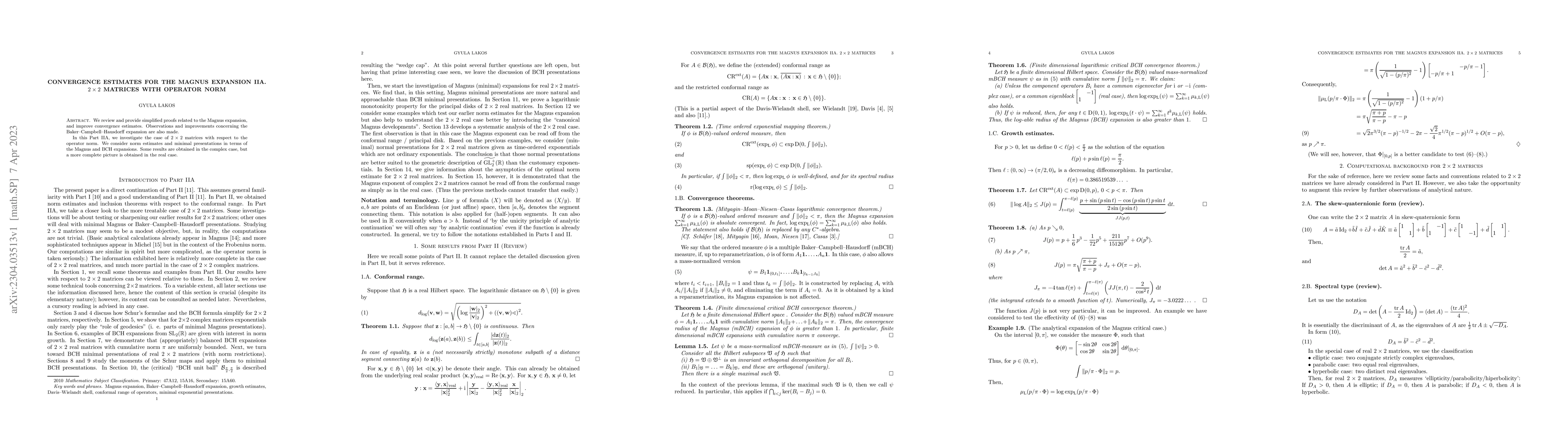 We review and provide simplified proofs related to the Magnus expansion, and improve convergence estimates. Observations and improvements concerning the Baker--Campbell--Hausdorff expansion are also made. In this Part IIA, we investigate the case of $2\times2$ matrices with respect to the operator norm. We consider norm estimates and minimal presentations in terms of the Magnus and BCH expansions. Some results are obtained in the complex case, but a more complete picture is obtained in the real case.