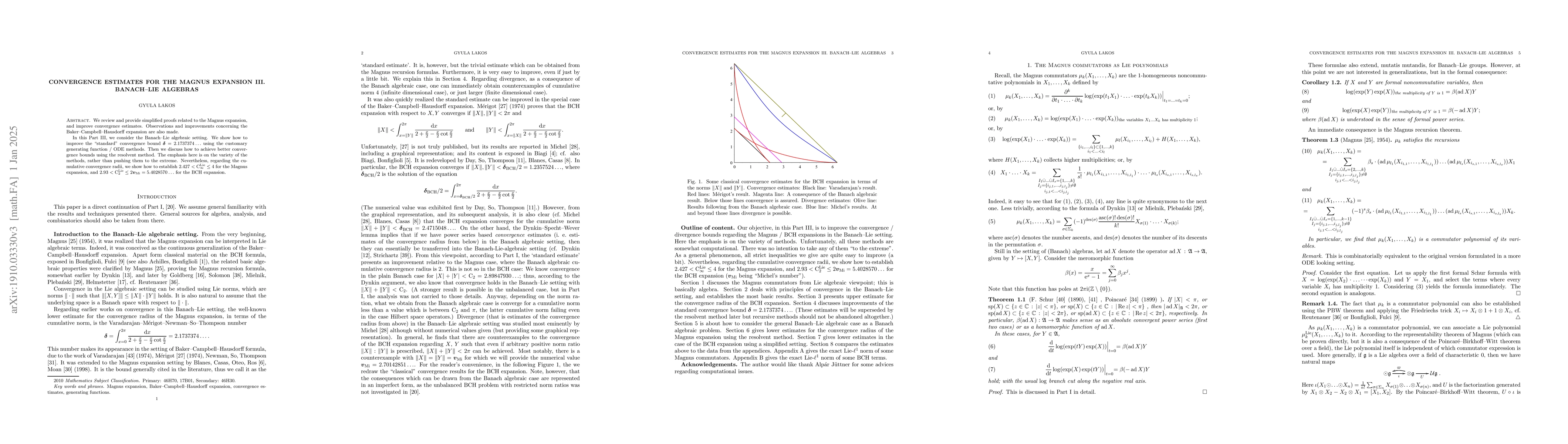 We review and provide simplified proofs related to the Magnus expansion, and improve convergence estimates. Observations and improvements concerning the Baker--Campbell--Hausdorff expansion are also made. In this Part III, we consider the Banach--Lie algebraic setting. We show how to improve the "standard" convergence bound $\boldsymbol\delta= 2.1737374\ldots$ using the customary generating function / ODE methods. Then we discuss how to achieve better convergence bounds using the resolvent method. The emphasis here is on the variety of the methods, rather than pushing them to the extreme. Nevertheless, regarding the cumulative convergence radii, we show how to establish $2.427<\mathrm C_\infty^{\mathrm{Lie}}\leq 4$ for the Magnus expansion, and $2.93<\mathrm C^{\mathrm{Lie}}_2 \leq 4\sqrt2=5.656\ldots$ for the BCH expansion.