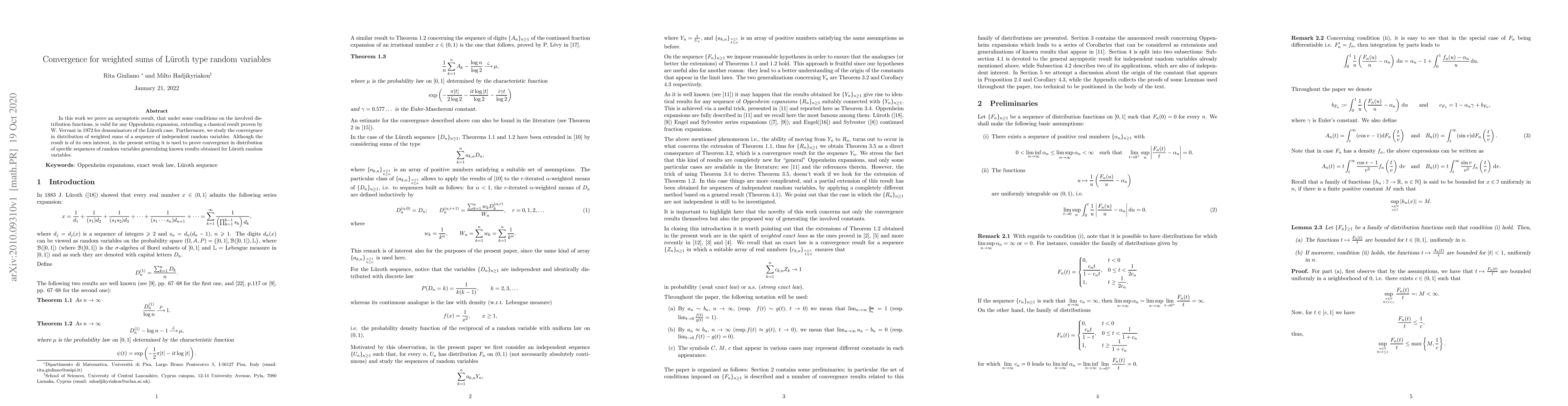 In this work we prove an asymptotic result, that under some conditions on the involved distribution functions, is valid for any Oppenheim expansion, extending a classical result proven by W. Vervaat in 1972 for denominators of the Luroth case. Furthermore, we study the convergence in distribution of weighted sums of a sequence of independent random variables. Although the result is of its own interest, in the present setting it is used to prove convergence in distribution of specific sequences of random variables generalizing known results obtained for Luroth random variables.