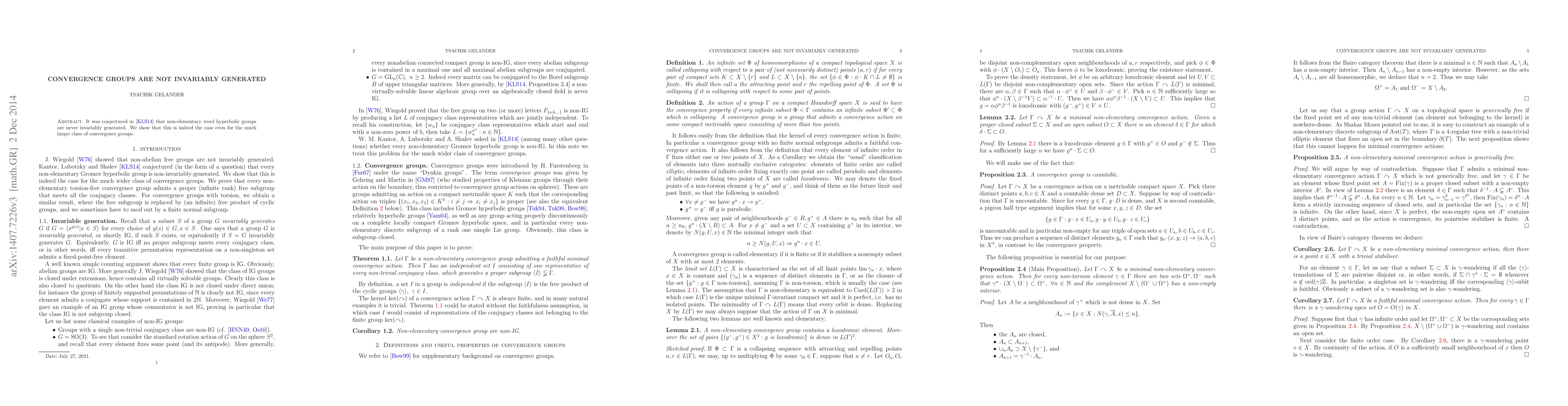 Summary: The paper disproves the conjecture that non-elementary word hyperbolic groups are invariably generated by demonstrating that this property does not hold for the broader class of convergence groups. This finding extends the understanding of group generation in geometric group theory.