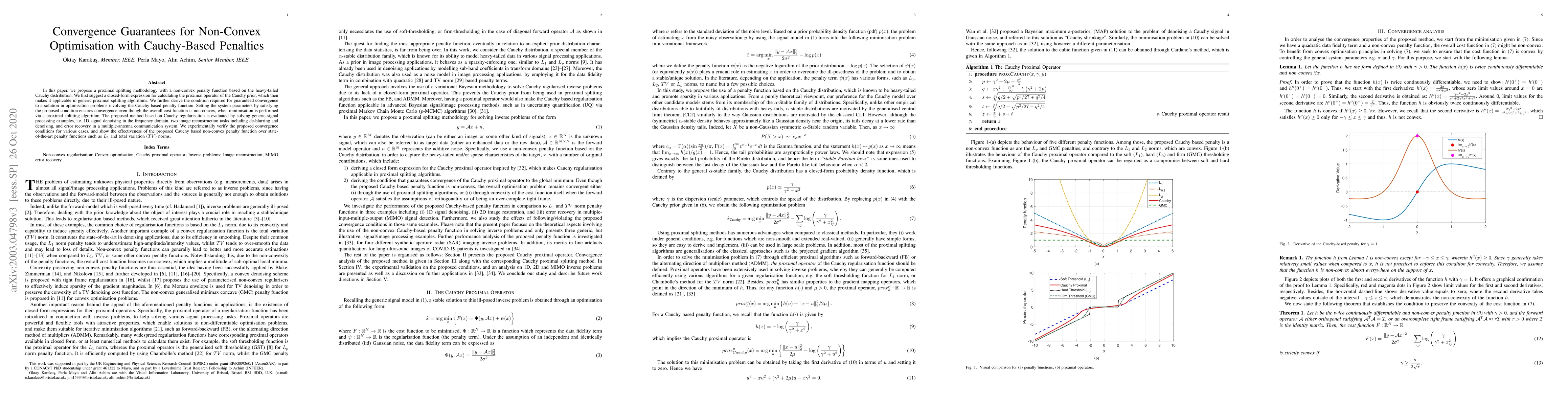 This paper proposes a proximal splitting methodology with a non-convex Cauchy-based penalty for optimisation, offering a closed-form proximal operator and convergence guarantees for non-convex problems. Experimental results demonstrate its effectiveness over $L_1$ and total variation norms in various signal processing tasks.