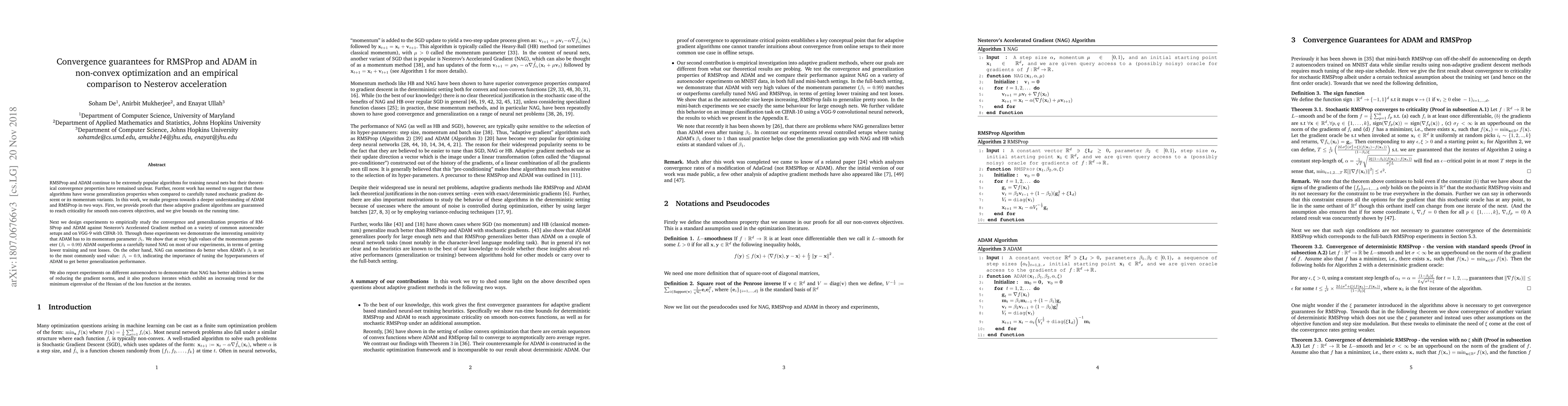This paper provides theoretical convergence guarantees for RMSProp and ADAM in non-convex optimization and compares their performance empirically to Nesterov's Accelerated Gradient (NAG). The study shows that ADAM can outperform NAG at high momentum values, but NAG can sometimes be better when ADAM's momentum is set to a more typical value, highlighting the importance of hyperparameter tuning.