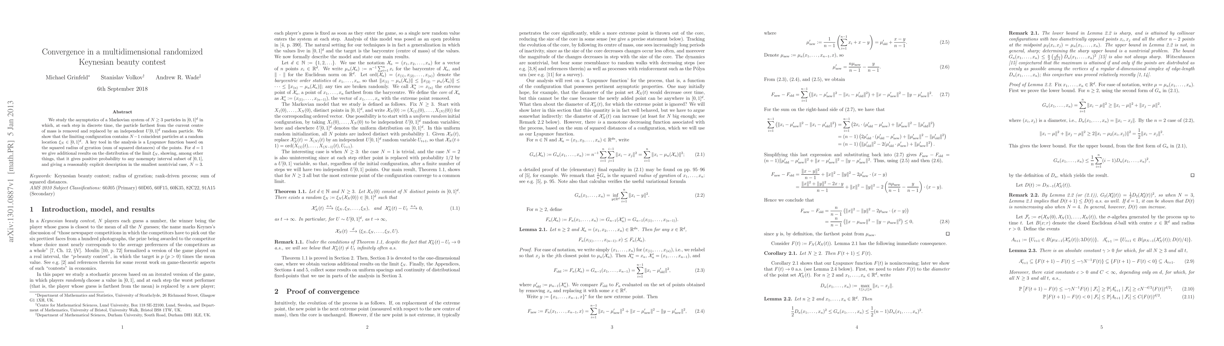 This research analyzes a Markovian system of particles in a multidimensional space, showing that in the limit, most particles converge to a single point with high probability. A squared radius of gyration-based Lyapunov function aids the analysis. For one dimension, it reveals that the limiting location can be any non-empty interval subset of [0,1], with specific results for N=3 particles.