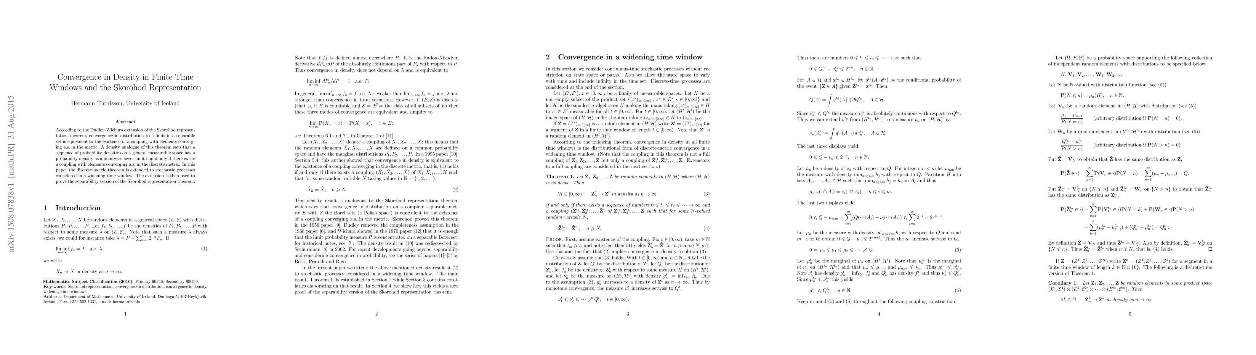 According to the Dudley-Wichura extension of the Skorohod representation theorem, convergence in distribution to a limit in a separable set is equivalent to the existence of a coupling with elements converging a.s. in the metric. A density analogue of this theorem says that a sequence of probability densities on a general measurable space has a probability density as a pointwise lower limit if and only if there exists a coupling with elements converging a.s. in the discrete metric. In this paper the discrete-metric theorem is extended to stochastic processes considered in a widening time window. The extension is then used to prove the separability version of the Skorohod representation theorem.