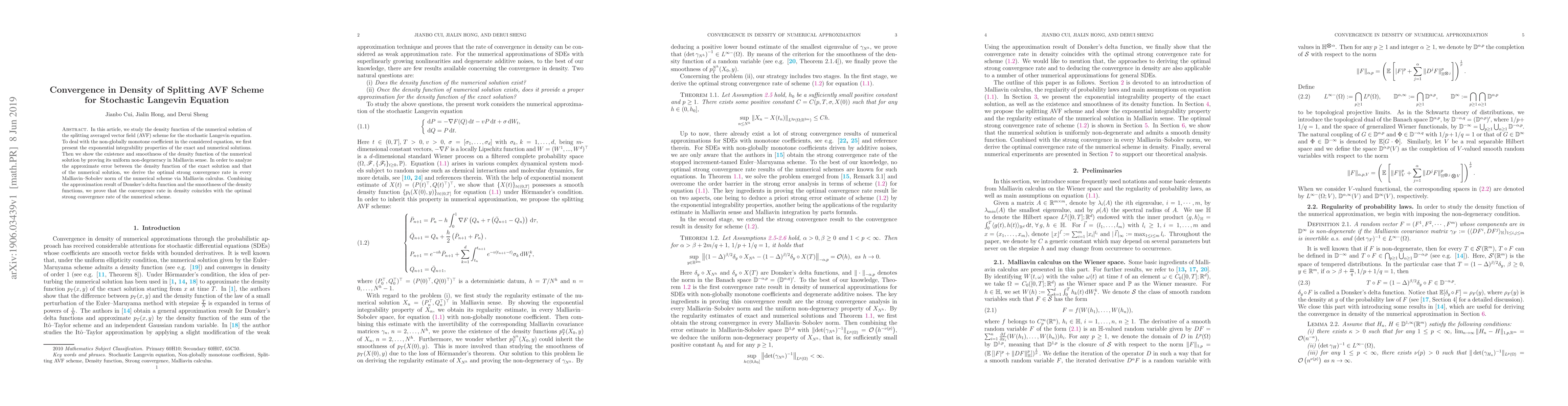 This paper investigates the density function of the splitting averaged vector field (AVF) scheme for stochastic Langevin equations, proving its existence, smoothness, and uniform non-degeneracy. It also establishes the optimal strong convergence rate in Malliavin-Sobolev norms, demonstrating that the convergence rate in density matches the numerical scheme's optimal rate.