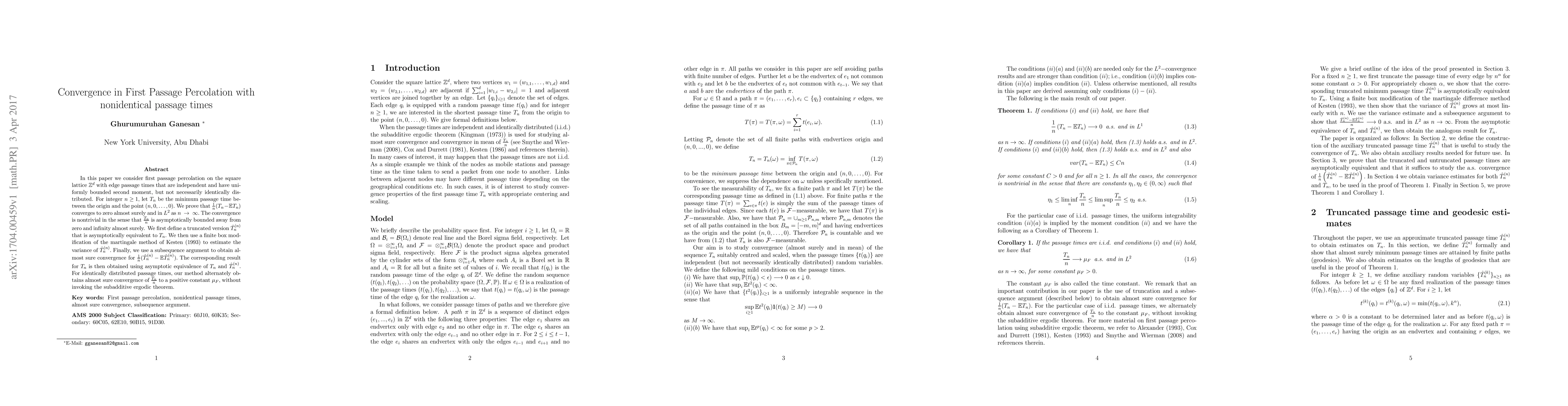 This paper investigates first passage percolation on \(\mathbb{Z}^d\) with nonidentically distributed passage times, proving that \(\frac{1}{n}(T_n-\mathbb{E}T_n)\) converges to zero almost surely and in \(L^2\). The study uses a truncated version and a martingale method to achieve this convergence.