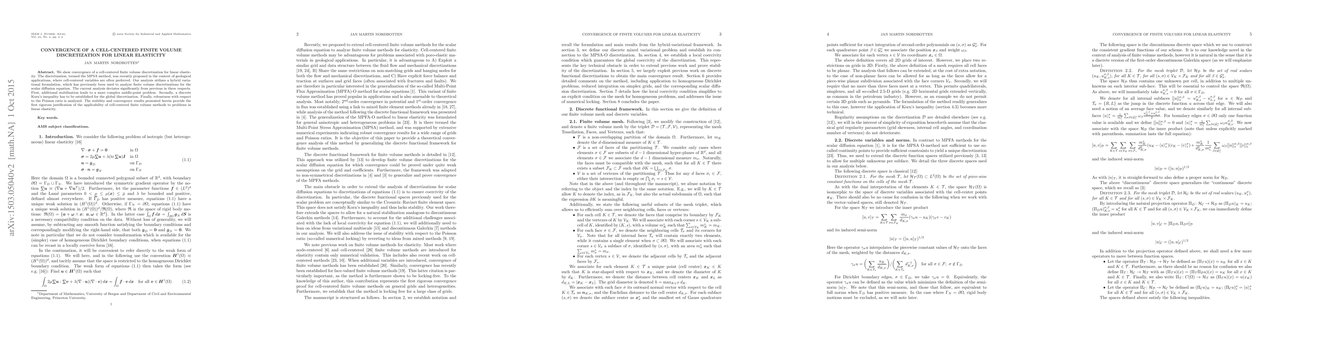 We show convergence of a cell-centered finite volume discretization for linear elasticity. The discretization, termed the MPSA method, was recently proposed in the context of geological applications, where cell-centered variables are often preferred. Our analysis utilizes a hybrid variational formulation, which has previously been used to analyze finite volume discretizations for the scalar diffusion equation. The current analysis deviates significantly from previous in three respects. First, additional stabilization leads to a more complex saddle-point problem. Secondly, a discrete Korn's inequality has to be established for the global discretization. Finally, robustness with respect to the Poisson ratio is analyzed. The stability and convergence results presented herein provide the first rigorous justification of the applicability of cell-centered finite volume methods to problems in linear elasticity.