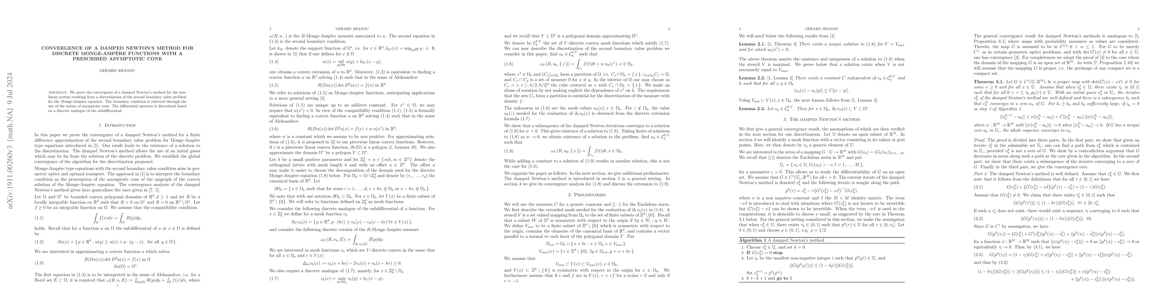 We prove the convergence of a damped Newton's method for the nonlinear system resulting from a discretization of the second boundary value problem for the Monge-Ampere equation. The boundary condition is enforced through the use of the notion of asymptotic cone. The differential operator is discretized based on a partial discrete analogue of the subdifferential.
