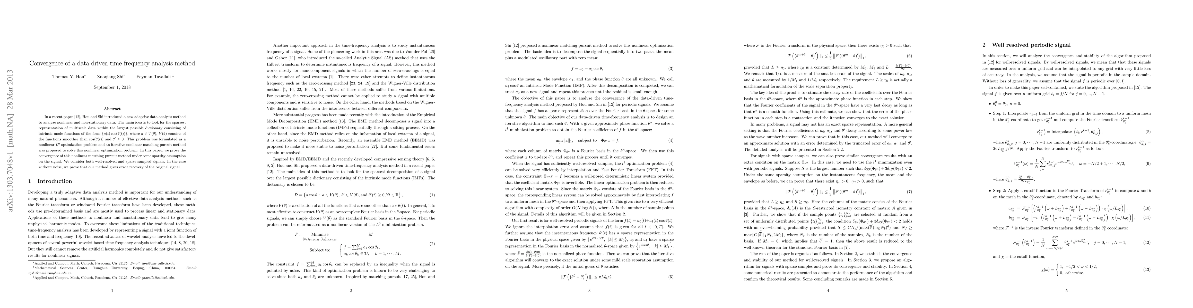 In a recent paper, Hou and Shi introduced a new adaptive data analysis method to analyze nonlinear and non-stationary data. The main idea is to look for the sparsest representation of multiscale data within the largest possible dictionary consisting of intrinsic mode functions of the form $\{a(t) \cos(\theta(t))\}$, where $a \in V(\theta)$, $V(\theta)$ consists of the functions smoother than $\cos(\theta(t))$ and $\theta'\ge 0$. This problem was formulated as a nonlinear $L^0$ optimization problem and an iterative nonlinear matching pursuit method was proposed to solve this nonlinear optimization problem. In this paper, we prove the convergence of this nonlinear matching pursuit method under some sparsity assumption on the signal. We consider both well-resolved and sparse sampled signals. In the case without noise, we prove that our method gives exact recovery of the original signal.
