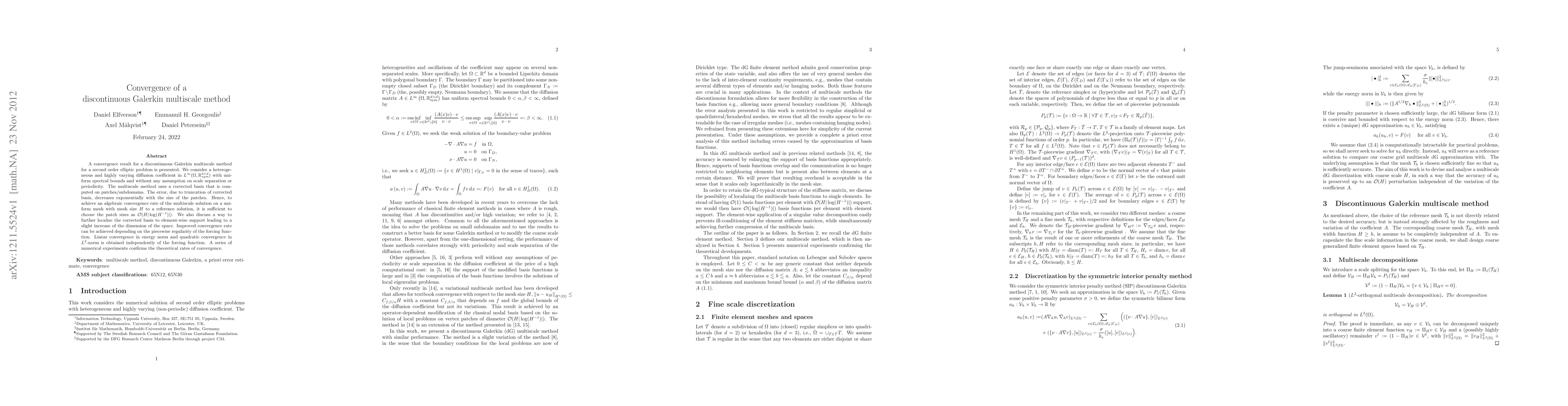 A convergence result for a discontinuous Galerkin multiscale method for a second order elliptic problem is presented. We consider a heterogeneous and highly varying diffusion coefficient in $L^\infty(\Omega,\mathbb{R}^{d\times d}_{sym})$ with uniform spectral bounds and without any assumption on scale separation or periodicity. The multiscale method uses a corrected basis that is computed on patches/subdomains. The error, due to truncation of corrected basis, decreases exponentially with the size of the patches. Hence, to achieve an algebraic convergence rate of the multiscale solution on a uniform mesh with mesh size $H$ to a reference solution, it is sufficient to choose the patch sizes as $\mathcal{O}(H|\log(H^{-1})|)$. We also discuss a way to further localize the corrected basis to element-wise support leading to a slight increase of the dimension of the space. Improved convergence rate can be achieved depending on the piecewise regularity of the forcing function. Linear convergence in energy norm and quadratic convergence in $L^2$-norm is obtained independently of the forcing function. A series of numerical experiments confirms the theoretical rates of convergence.