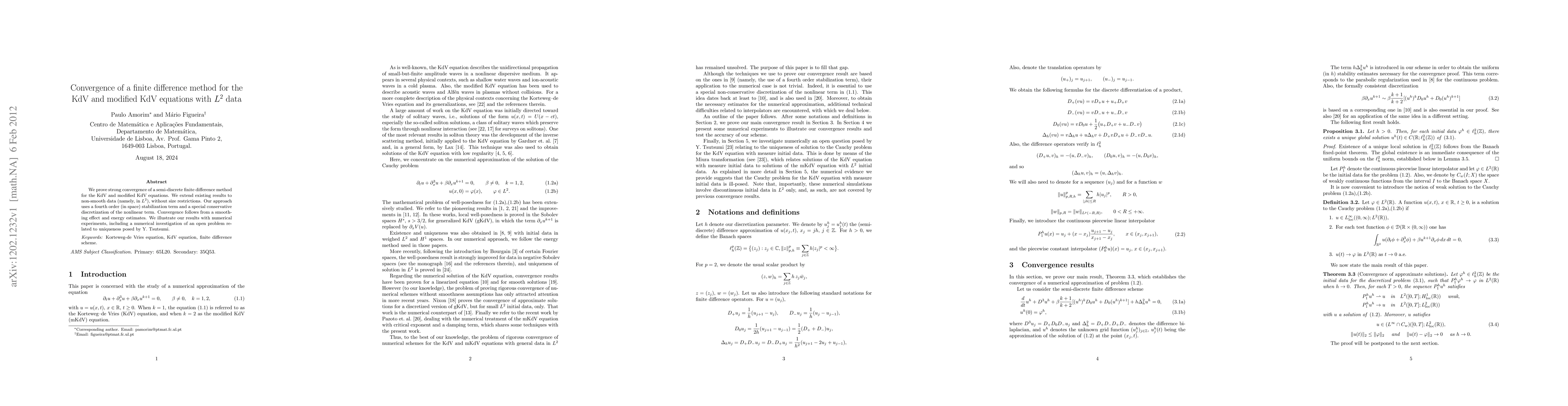 This paper proves strong convergence for a semi-discrete finite difference method applied to the KdV and modified KdV equations using $L^2$ data, extending previous results without size restrictions. The method incorporates a fourth-order stabilization term and a conservative discretization, achieving convergence through a smoothing effect and energy estimates.