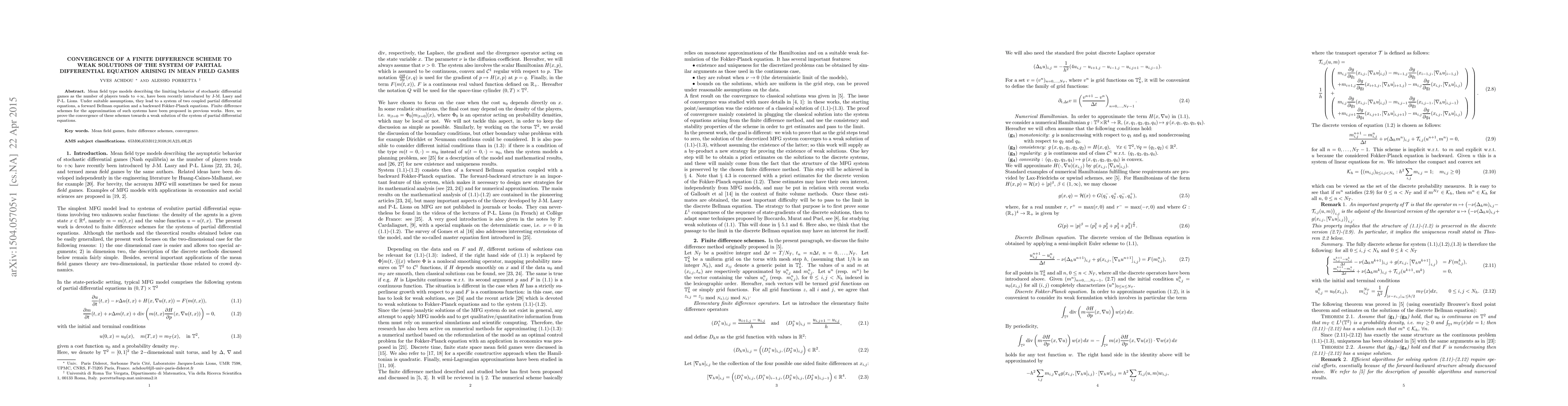 This paper proves the convergence of finite difference schemes to weak solutions for a system of partial differential equations arising from mean field games, which describe the behavior of stochastic differential games as the number of players approaches infinity. The focus is on the convergence under suitable assumptions.