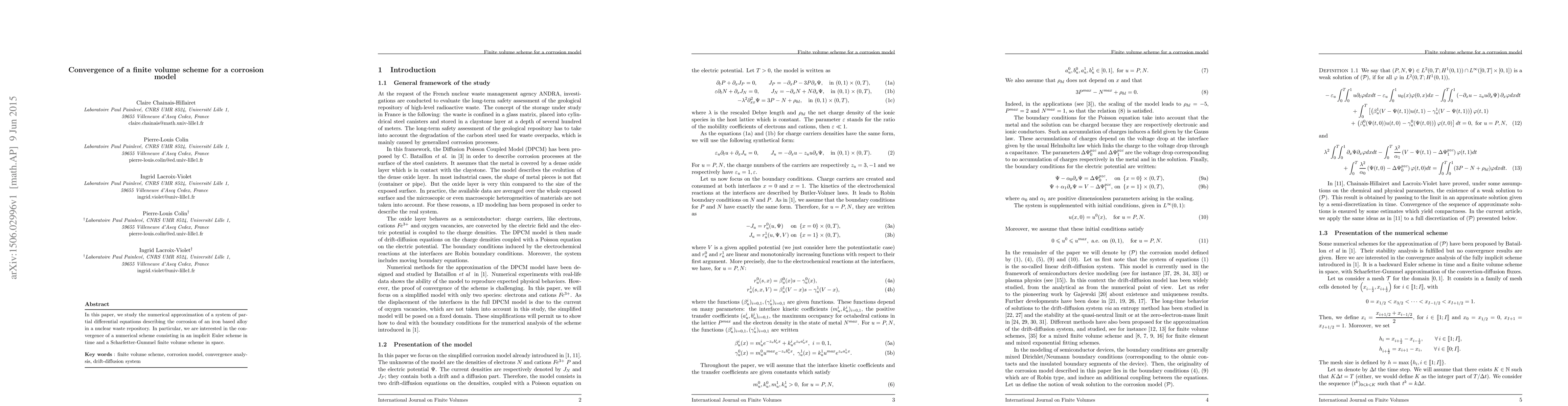 In this paper, we study the numerical approximation of a system of partial dif-ferential equations describing the corrosion of an iron based alloy in a nuclear waste repository. In particular, we are interested in the convergence of a numerical scheme consisting in an implicit Euler scheme in time and a Scharfetter-Gummel finite volume scheme in space.