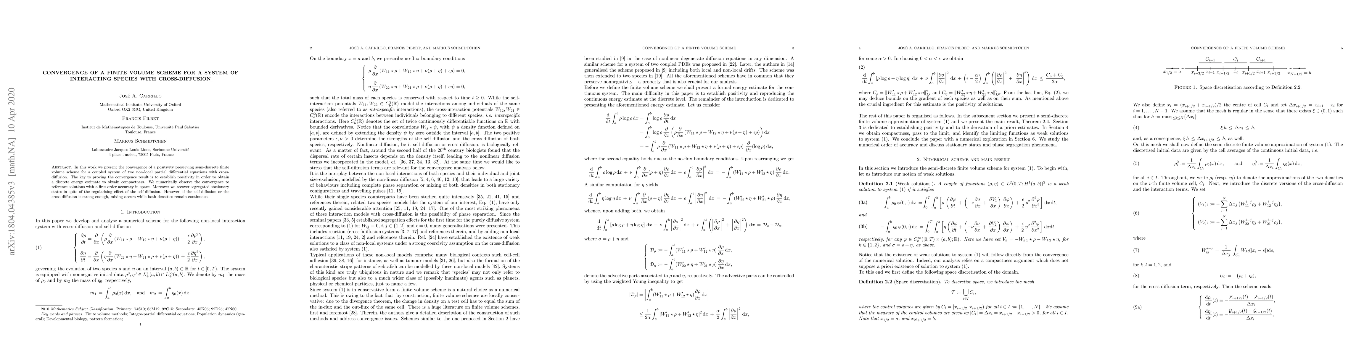 This paper presents the convergence of a finite volume scheme for a system of two interacting species with cross-diffusion, proving positivity and compactness to achieve first-order spatial accuracy. Despite self-diffusion, segregated stationary states are recovered, but strong diffusion leads to mixing while maintaining density continuity.